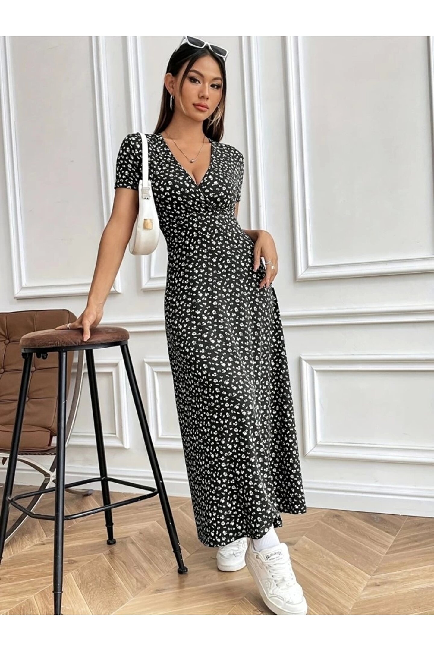 Kadın Kısa Kollu Kruvaze Yakalı çiçek Desenli Süprem Elbise