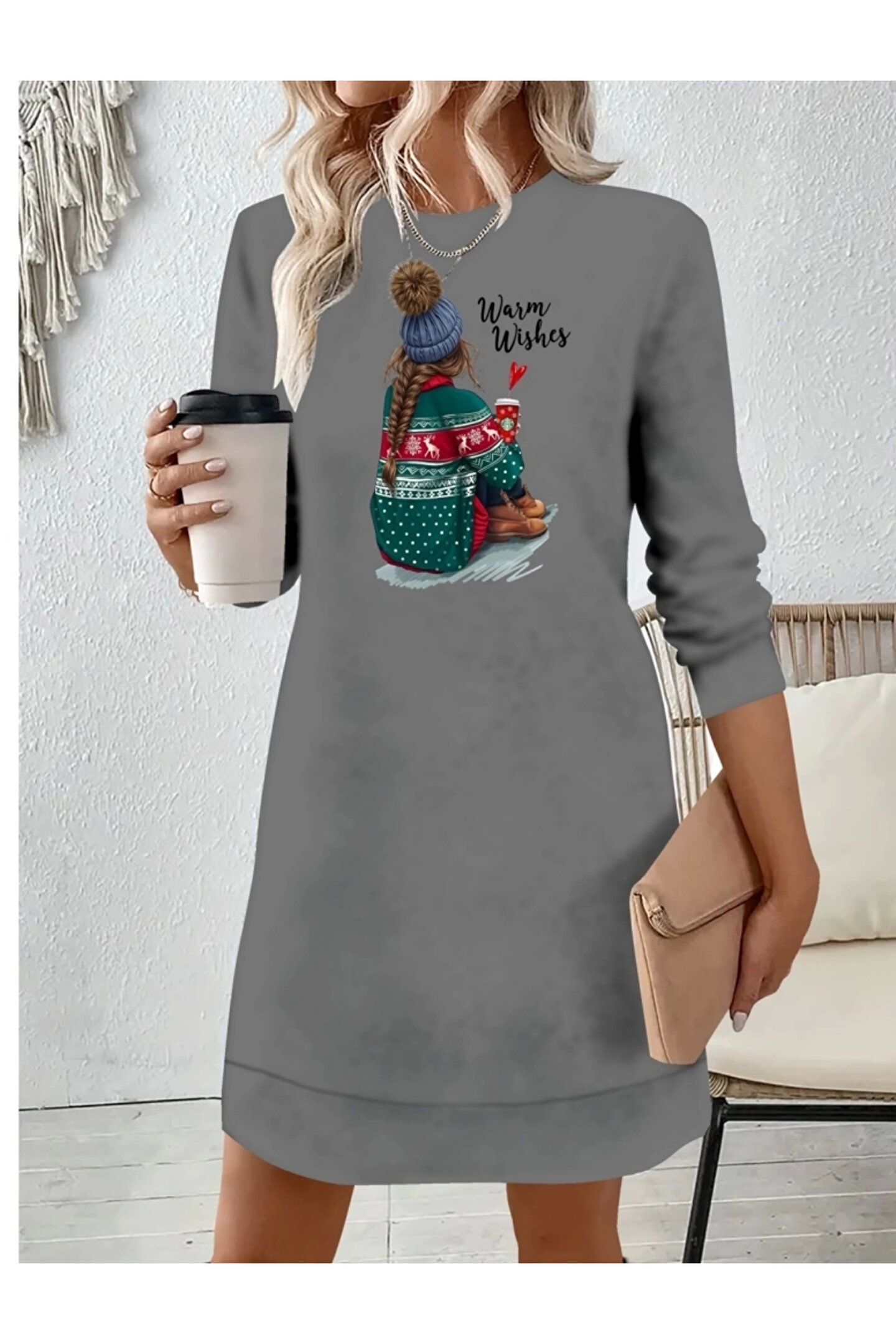 Kadın Uzun Kollu Bisiklet Yaka Desenli Viskon Iki Iplik Elbise
