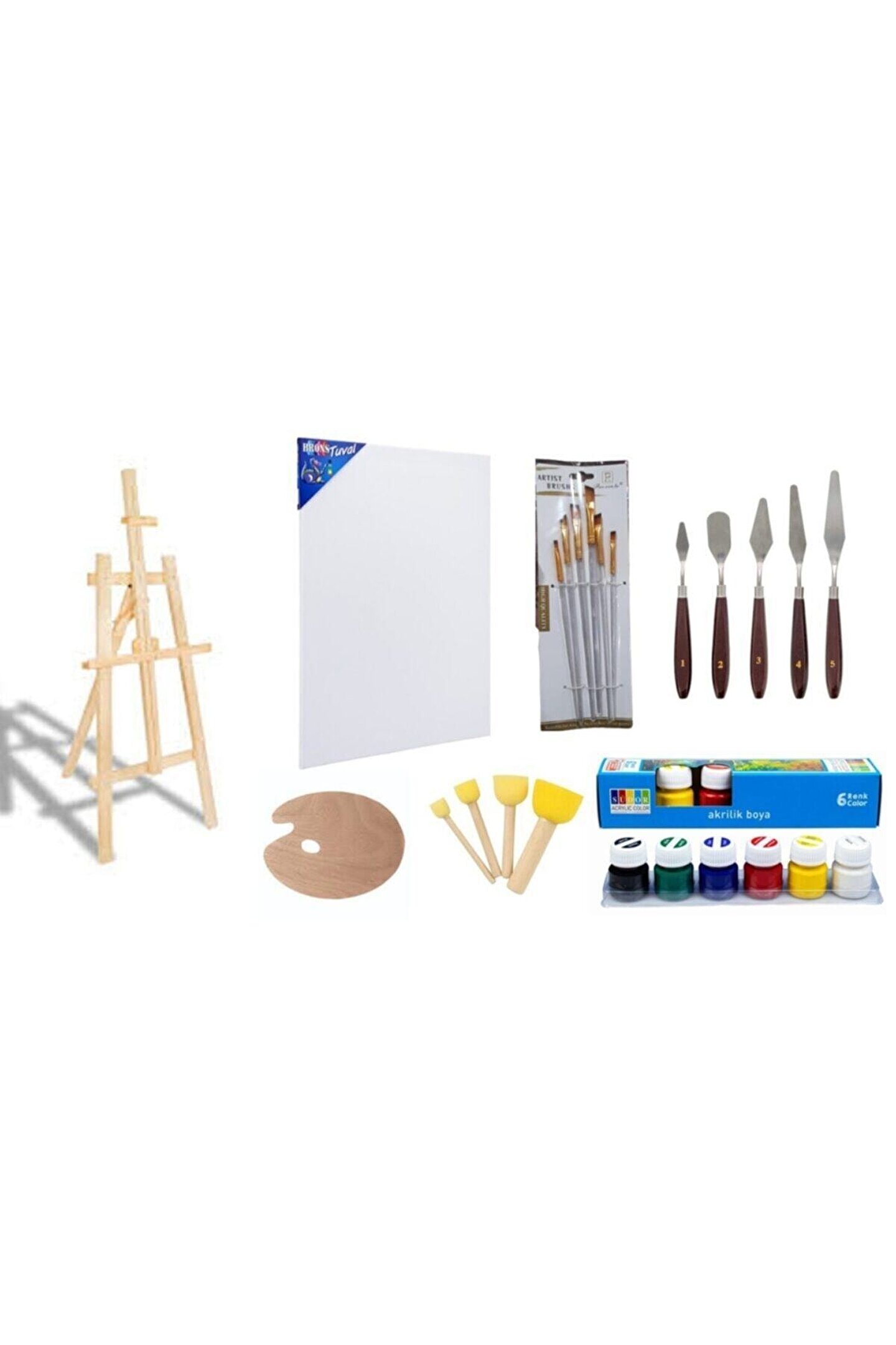 175 cm 1. Kalite Ahşap Şövale 35x50 Tuval Ahşap Büyük Boy Palet 4 Parça Pon pon Fırça 6 Parça Şeffaf Gövdeli Fırça Seti 5 Parça Metali Spatül 6 Renk Akrilik Boya Seti