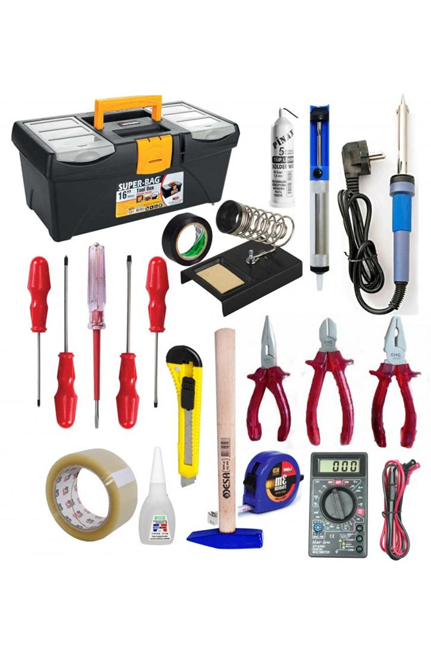 KALFA TAKIM ÇANTASI 1; 1 adet 16" Takım Çantası 2; 1 adet Tudor 60W Kalem Havya 3; 1 adet Tüp Lehim Teli 1,2mm 4; 1 adet Havya Standı; Havya Sehpası 5; 1 adet Lehim Pompası 6; 1 adet DT830D Dijital Multimetre 7; 1 adet Yıldız Tornavida 5x100 mm 8; 1 adet Düz Tornavida 5x100 mm 9; 1 adet Yıldız Tornavida 4x100 mm 10; 1 adet Düz Tornavida 4x100 mm 11; 1 adet Kontrol Kalemi 12; 1 adet Yan Keski 160 mm 13; 1 adet Karga Burun 160 mm 14; 1 adet Pense 180 mm 15; 1 adet 502 Japon Yapıştırıcısı 16; 1 adet Şerit Metre (3 Metre) 17; 1 adet Çekiç 300 gr 19; 1 adet Maket Bıçağı (Falçata) 20; 1 adet İzole bant 21; 1 adet Koli bandı;