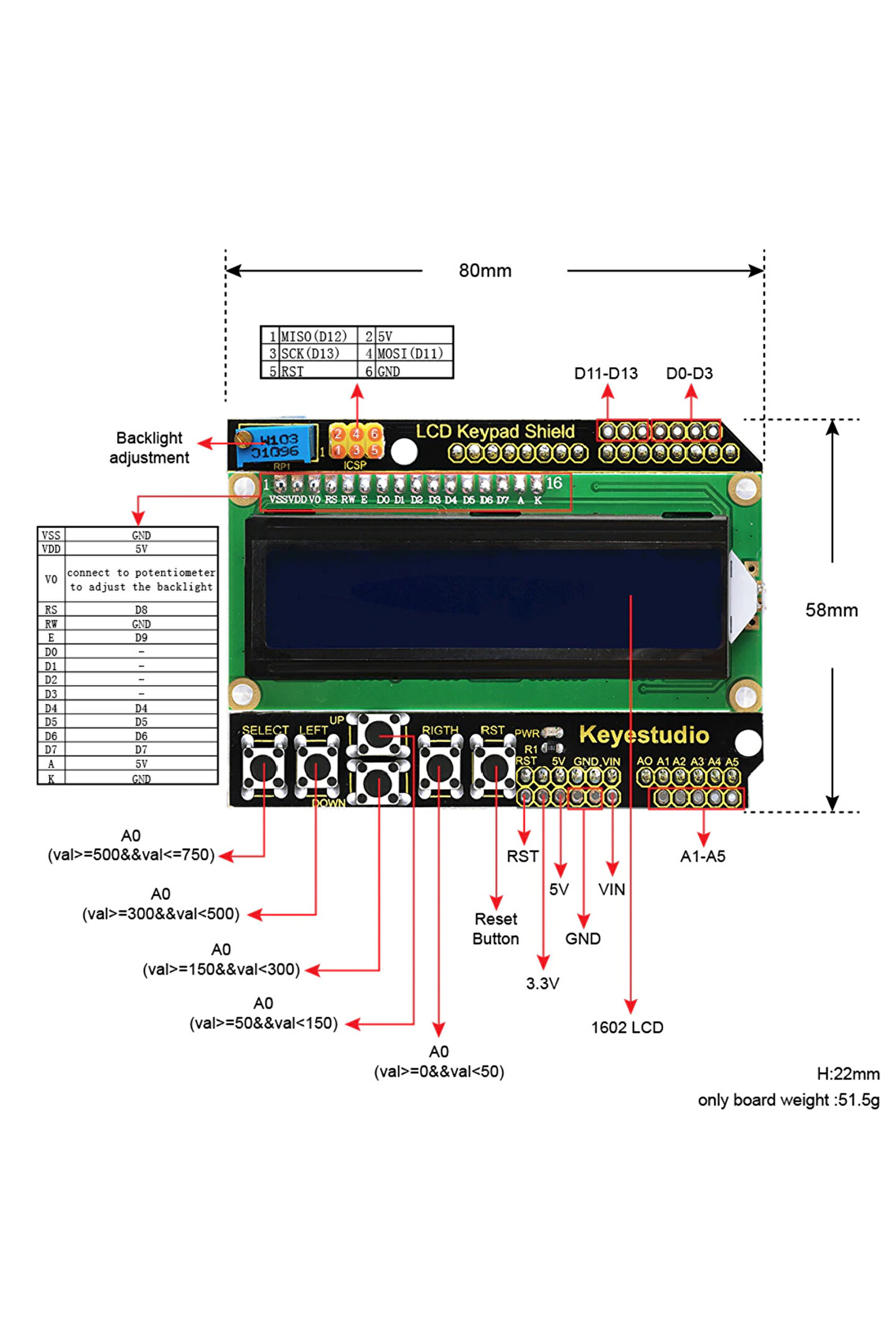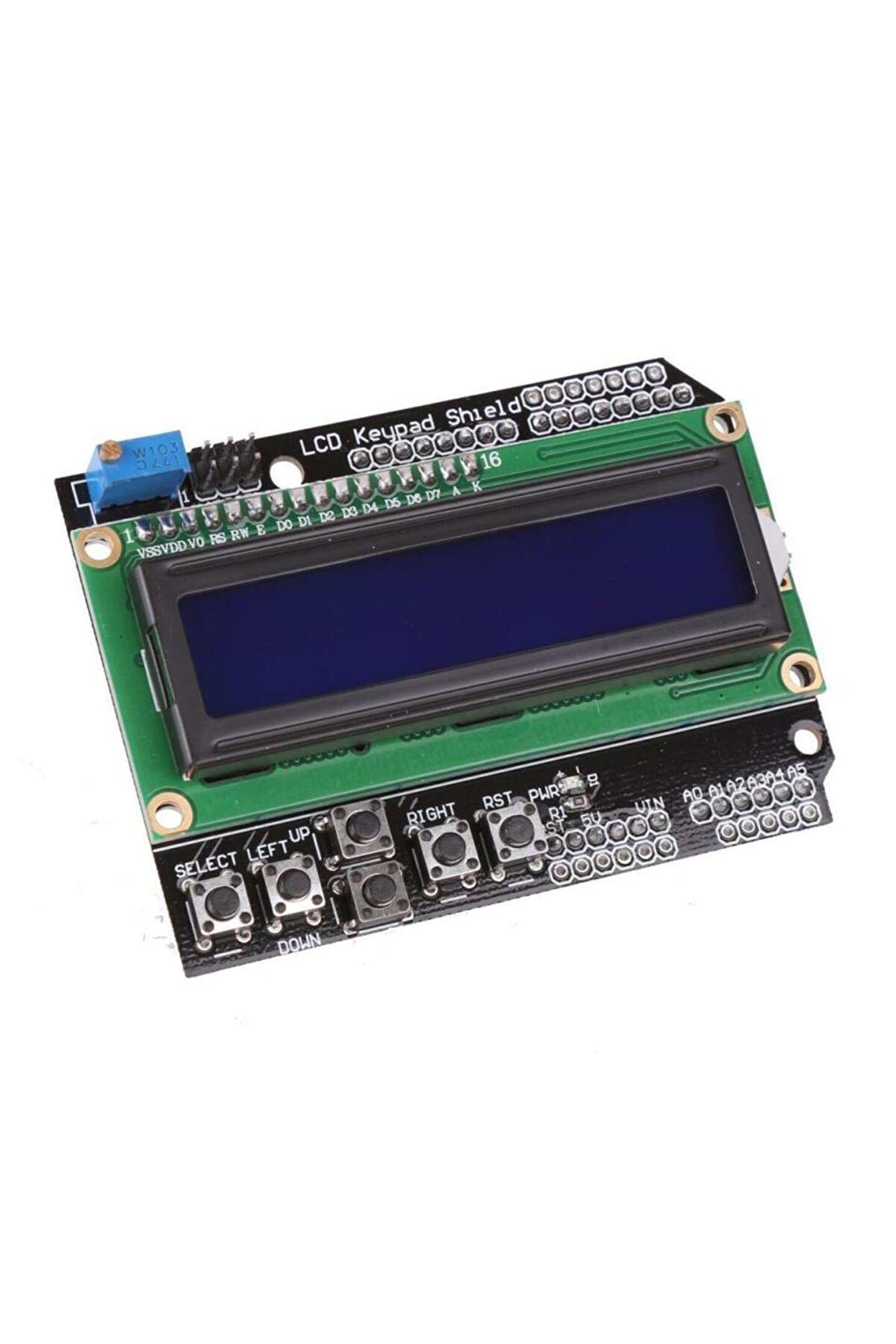 Arduino ile Uyumlu LCD ve Tuş Takımı Shieldi Arduino ile LCD ekran kullanırken jumper kullanılması pin sayısının çok olmasından dolayı karmaşıklığa sebep olabilmektedir. Bu shield sayesinde LCD ekran bağlantıları ile uğraşmadan, hata dersi olmadan hızlıca kodlamaya geçebilirsiniz. LCD ve Tuş Takımı Shield, Arduino Uno ve benzeri kartlarla kullanabileceğiniz, üzerinde tüm bağlantıları yapılmış şekilde 16x2 LCD ekran ve 5 adet programlanabilir push buton bulunan arduino shield kartıdır. LCD ekran kontrast ayarı yapabilmek için dahili trimpot bulunmaktadır. Push butonlar A0 pinine bağlanmaktadır. Butonlara basıldığı durumda A0 pininden okunan değer farklılık göstermektedir. Her buton için okunan değer farklıdır. Bu sayede hangi butona basıldığı anlaşılmaktadır. Bu konuda detaylı bilgi için bu videoyu izleyebilirsiniz. LCD ve butonlar tarafından kullanılmayan pinler, sisteme eklemek istediğiniz diğer modülleri bağlayabilmeniz için kart üzerine konulmuştur. Analog pinler kolay bir şekilde sensör bağlantısı yapılabilmesi açısından 3’lü formasyon (5V-GND-Sinyal) şeklinde kart üzerine eklenmiştir. Beraber Kullanılabilecek Ürünler: Arduino Uno; Sensör Modülleri; Arduino Shieldları; Mikro SD Kart modülü; RTC Saat Modülü; Teknik Özellikler: Çalışma Voltajı : 5V; Menü için kullanılabilir 5 adet push buton; Reset Butonu; Kontrast ayarı yapabilmek için dahili trimpot; Kullanılmayan pinler dışarıya aktarılmıştır. Bu sayede farklı sensörler ve modüller ile beraber kullanılabilir.; Sensör bağlantısını kolaylaştırmak için analo pinlerde 3’lü (GND-5V-Sinyal) form çıkış; Kart Boyutu: 80mm x 58mm;