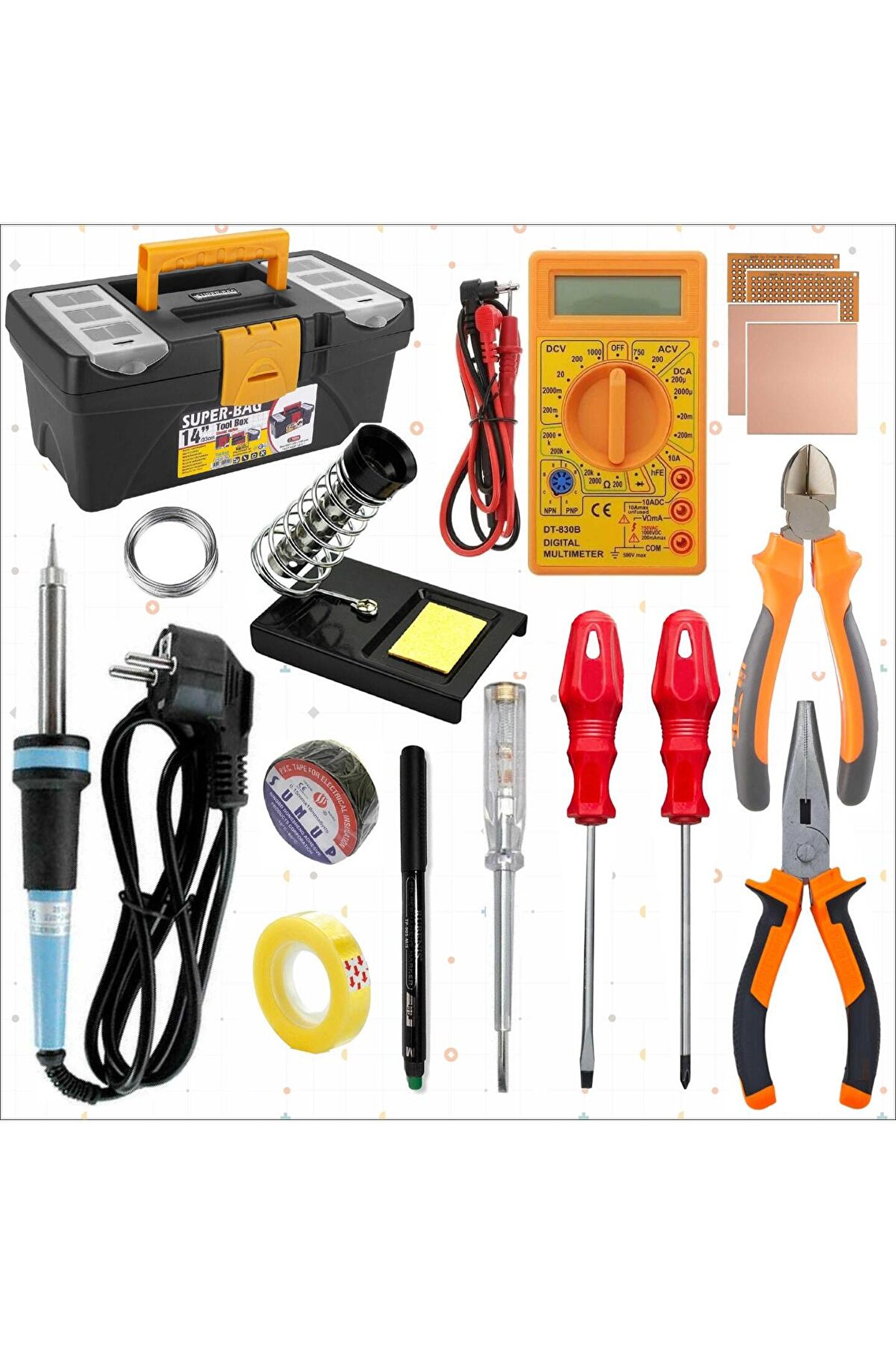 MESLEK LİSESİ TAKIM ÇANTASI 1; 1 adet 14" Takım Çantası 2; 1 adet 40W Kalem Havya 3; 1 adet Lehim Teli 1,2mm 4; 1 adet Havya Standı; Havya Sehpası 5; 1 adet DT830D Dijital Multimetre 6; 4 adet 50x50 mm Pertinaks 7; 1 adet Baskı Devre (Asetat) Kalemi 8; 1 adet Yıldız Tornavida 4x100 mm 9; 1 adet Düz Tornavida 4x100 mm 10; 1 adet Kontrol Kalemi 11; 1 adet Yan Keski 160 mm 12; 1 adet Karga Burun 160 mm 13; 1 adet İzole bant 14; 1 adet Şeffaf bant;