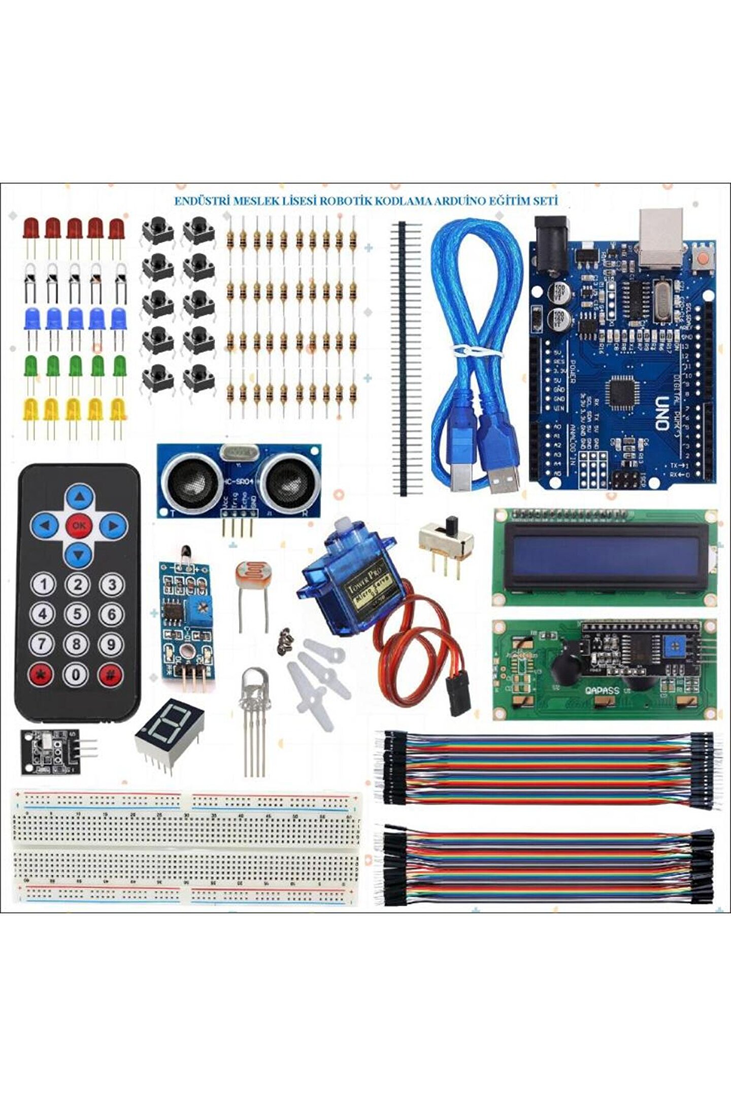 MESLEKİ VE TEKNİK ANADOLU LİSESİ ROBOTİK KODLAMA ARDUİNO UYGULAMA EĞİTİM SETİ 1; 1 adet Arduino UNO + USB Kablosu 2; 1 adet Breadboard 3; 20 adet Erkek; Erkek Jumper Kablo 4; 20 adet Dişi; Dişi Jumper Kablo 5; 40 adet Erkek; Dişi Jumper Kablo 6; 20 adet 220 ohm Direnç 7; 20 adet 10k Direnç 8; 3 adet 10k Potansiyometre 9; 10 adet Buton 10; 5 adet Kırmızı Led 11; 5 adet Beyaz Led 12; 5 adet Mavi Led 13; 5 adet Sarı Led 14; 5 adet Yeşil Led 15; 1 adet On Off Sürgülü Switch Anahtar 3 Pinli 2,54mm 16; 1 adet Işık Sensörü (LDR) 17; 1 adet RGB Led 18; 1 adet Buzzer 19; 1 adet 7 Segment Display Ortak Katot 20; 1 adet IR Kızılötesi Kumanda Kiti (Alıcı; Verici) 21; 1 adet Ultrasonik Mesafe Sensörü (HC; SR04) 22; 1 adet 2x16 LCD Ekran I2C Modüllü 23; 1 adet NTC Sıcaklık Algılama Sensör Modülü 24; 1 adet Servo Motor (SG90) Stok No: MESSET 1823 0922 170 Parça Eğitim Seti;