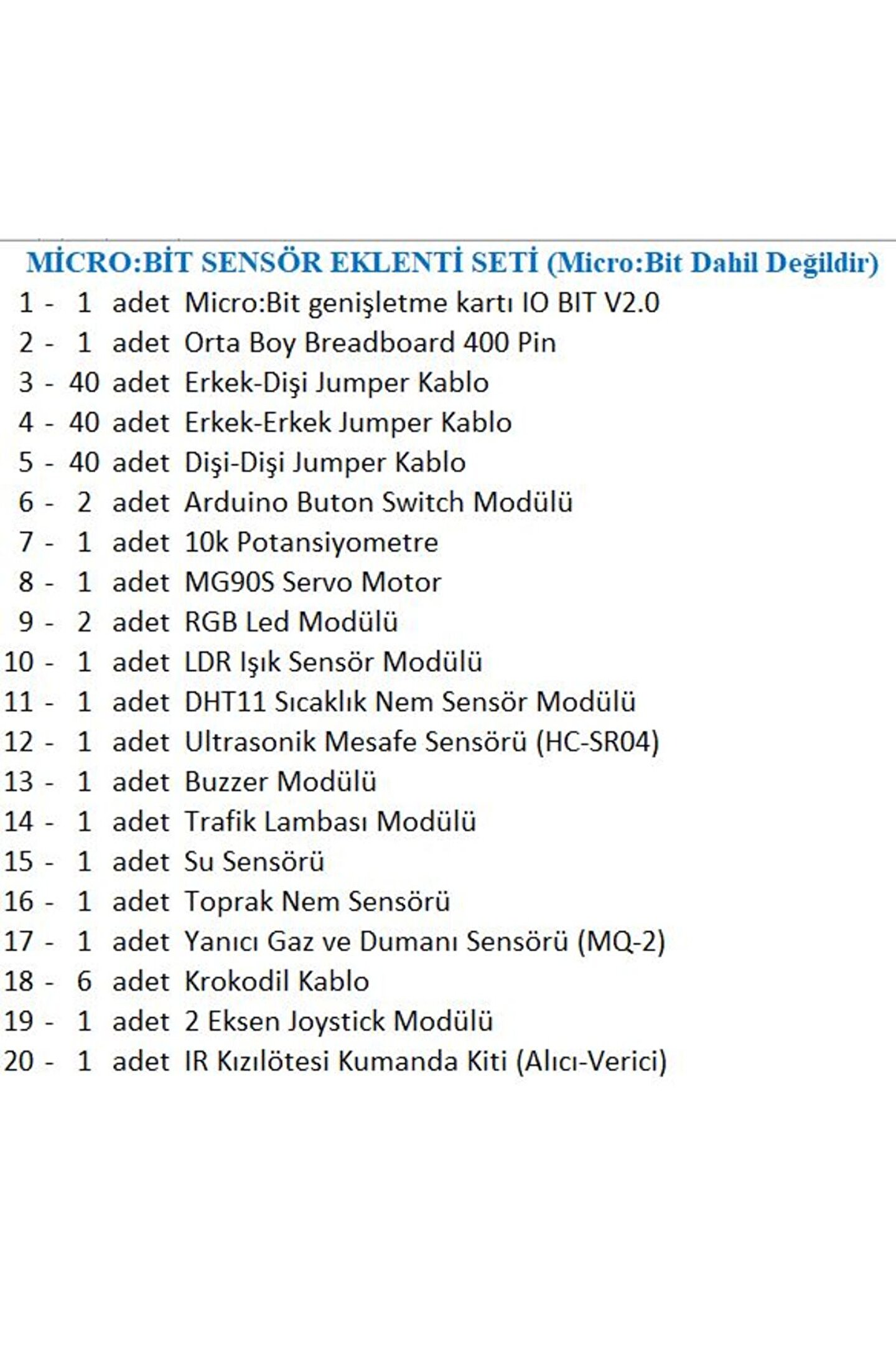 MİCRO:BİT SENSÖR EKLENTİ SETİ (Micro:Bit Dahil Değildir) 1; 1 adet Micro:Bit genişletme kartı IO BIT V2; 0 2; 1 adet Orta Boy Breadboard 400 Pin 3; 40 adet Erkek; Dişi Jumper Kablo 4; 40 adet Erkek; Erkek Jumper Kablo 5; 40 adet Dişi; Dişi Jumper Kablo 6; 2 adet Arduino Buton Switch Modülü 7; 1 adet 10k Potansiyometre 8; 1 adet MG90S Servo Motor 9; 2 adet RGB Led Modülü 10; 1 adet LDR Işık Sensör Modülü 11; 1 adet DHT11 Sıcaklık Nem Sensör Modülü 12; 1 adet Ultrasonik Mesafe Sensörü (HC; SR04) 13; 1 adet Buzzer Modülü 14; 1 adet Trafik Lambası Modülü 15; 1 adet Su Sensörü 16; 1 adet Toprak Nem Sensörü 17; 1 adet Yanıcı Gaz ve Dumanı Sensörü (MQ; 2) 18; 6 adet Krokodil Kablo 19; 1 adet 2 Eksen Joystick Modülü 20; 1 adet IR Kızılötesi Kumanda Kiti (Alıcı; Verici);