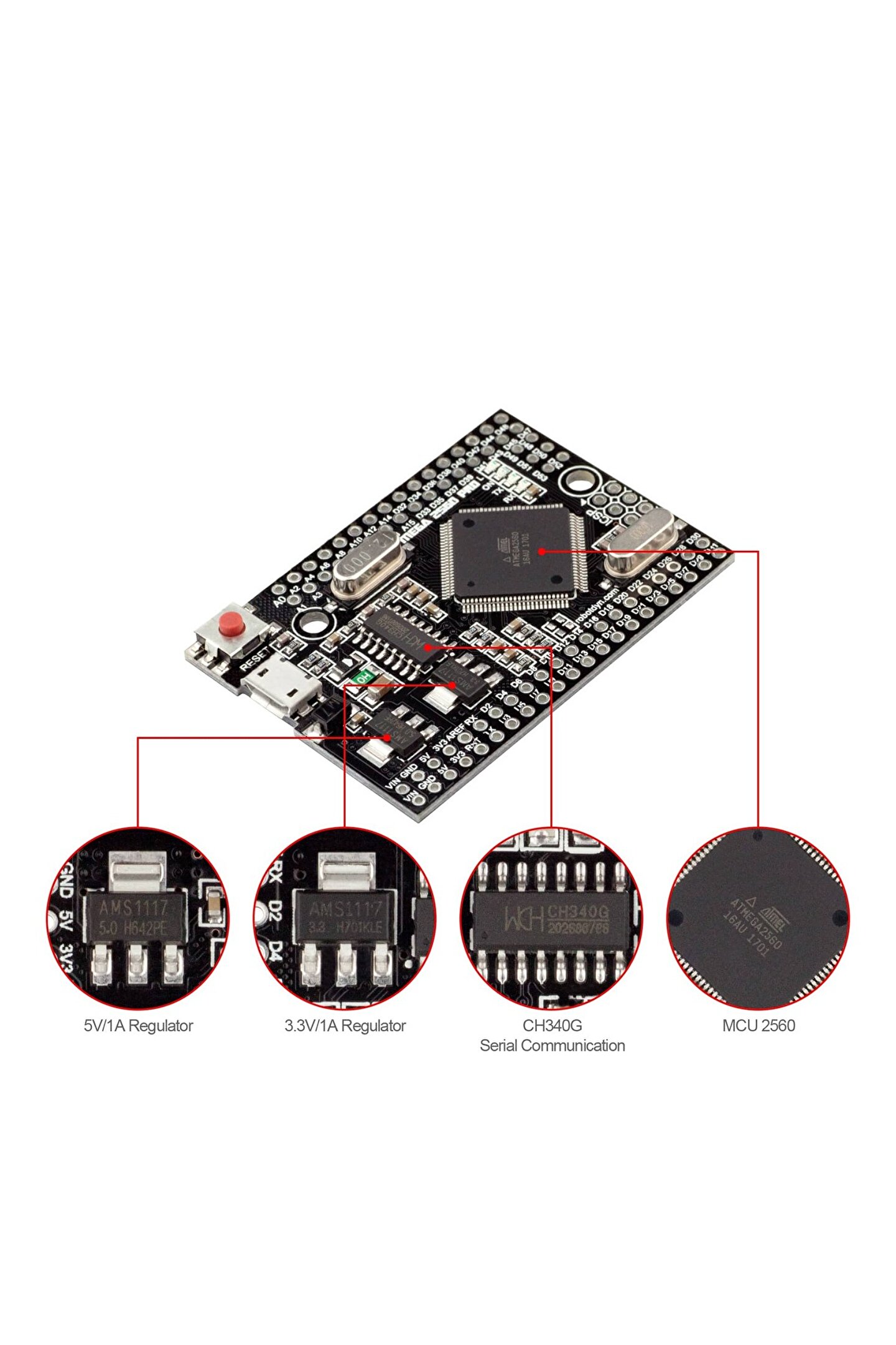 Mini Arduino Mega 2560 Pro (CH340) Arduino Mega2560 Pro ürünü arduino meganın küçültülmüş versiyonudur. Arduino Uno'dan daha fazla giriş çıkışa ve hafızaya sahip olması ayrıca megadan daha küçük boyutlarda olması sorunu ortadan kaldırmıştır. Projelerinizin neredeyse hepsi için kullanılabilirliğe sahiptir. Üründe 16 MHz atmega 2560 mikrokontroller kullanılmıştır. Kart üzerinde CH340G entegresi üzerinden direkt olarak PC'ye bağlanabilmektedir. PC'de oluşan com portu üzerinden Arduino IDE ile programlayabilirsiniz. Ürün Özellikleri: Mikrodenetleyici: ATmega2560; USB-TTL dönüştürücü: CH340; Güç Çıkışı: 5V-800mA; Güç GİRİŞİ: 5V; Güç GİRİŞİ: VIN / DC Jakı 9-12V; Güç Tüketimi: 5V 220mA; Mantık Seviyesi: 5V; USB: Mikro USB; Saat Frekansı: 16MHz; Çalışma Besleme Voltajı: 5V; Dijital G / Ç: 54; Analog G / Ç: 16; Bellek Boyutu: 256kb; Veri RAM Tipi / Boyutu: 8Kb; Veri ROM Tipi / Boyutu: 4Kb; Arayüz Tipi :ISP; Çalışma sıcaklığı: ?40? ° / + 85? °; Uzunluk × Genişlik: 38 × 54mm;
