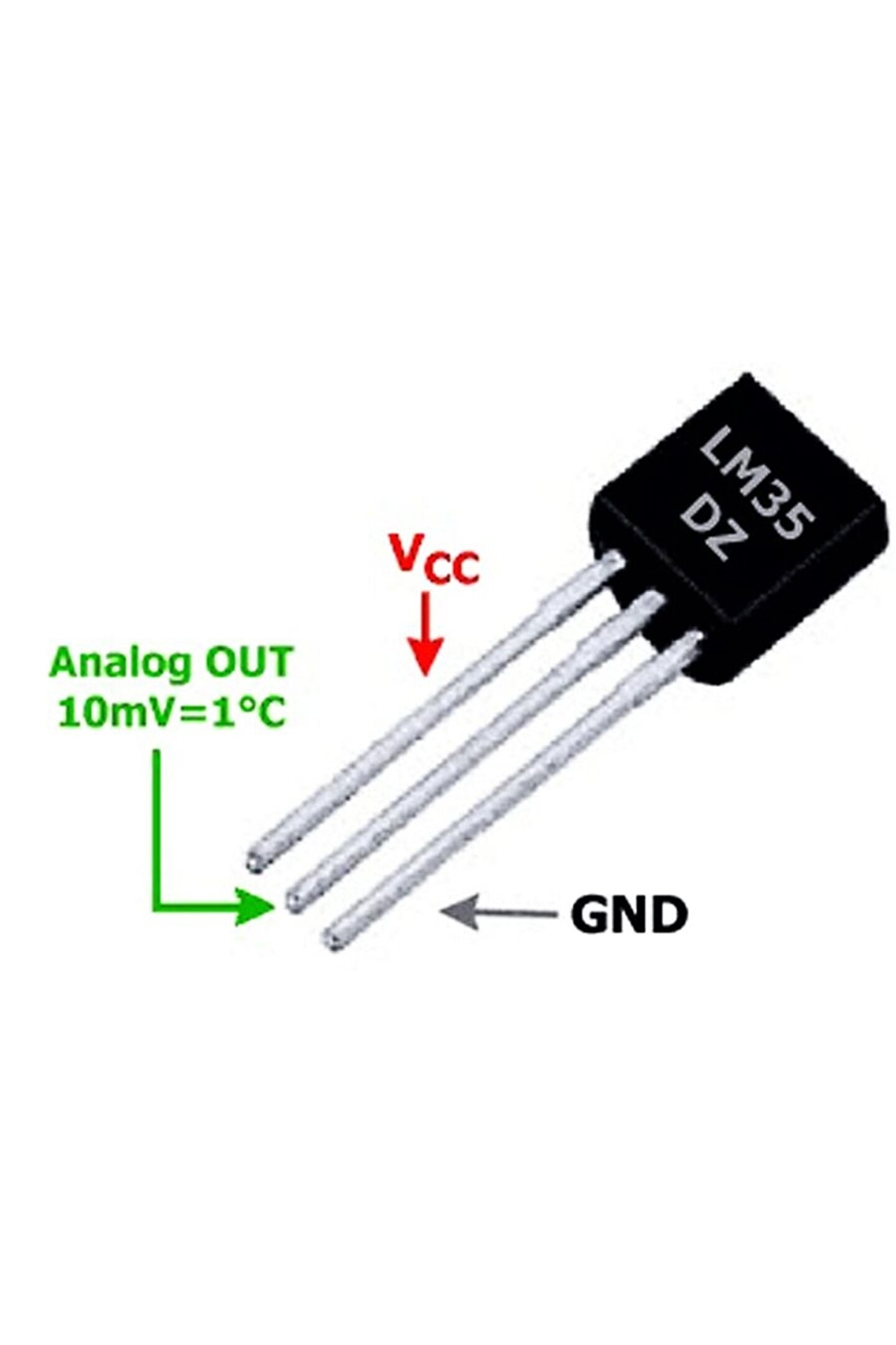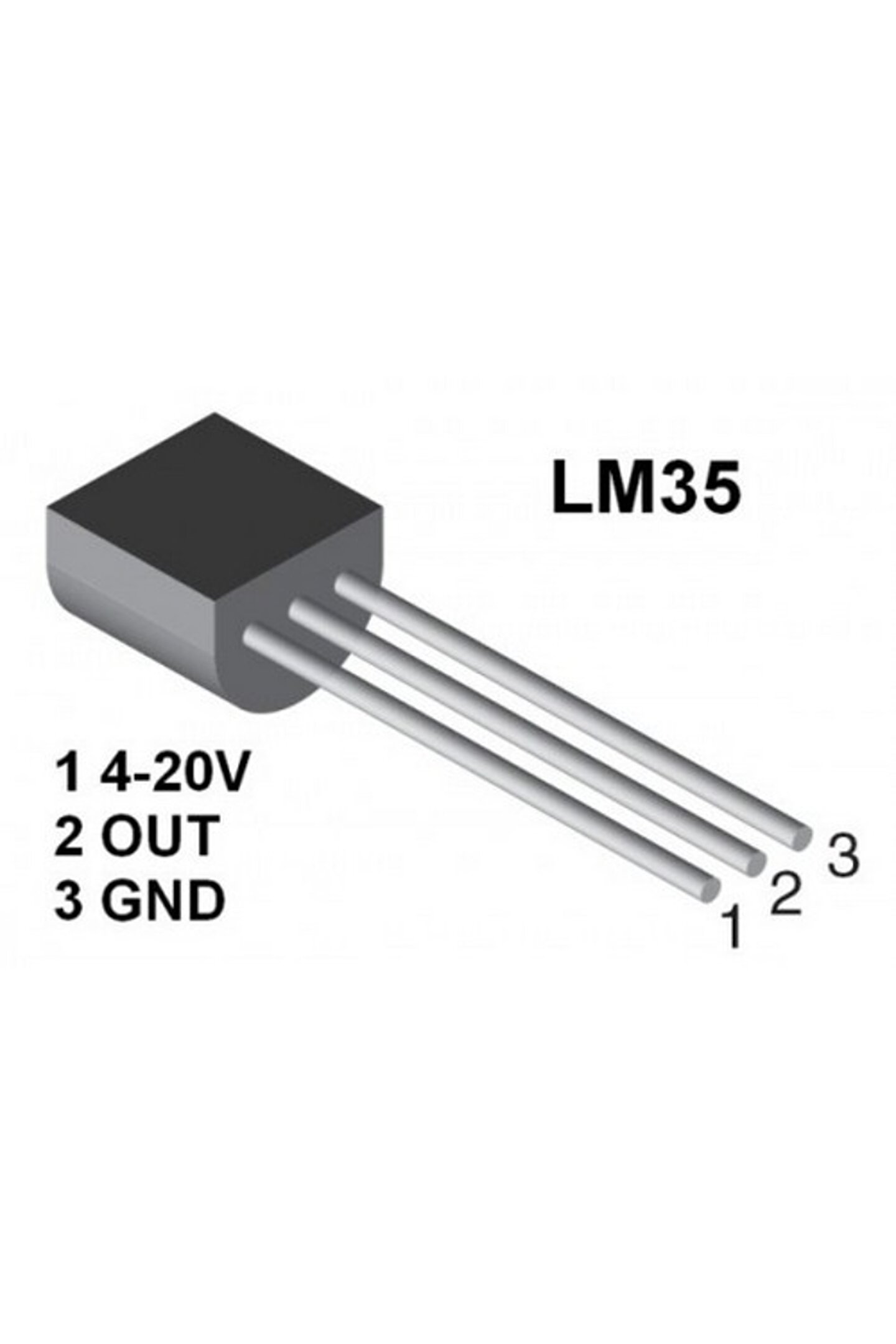 LM35 Sıcaklık Sensörü Uygun maliyetli yüksek kaliteli sıcaklık sensörüdür. ; Analog çıkış verir. ; -55 ile 150 derece arasında ölçüm yapabilir. ; 10mV/derece hassasiyete sahiptir. ; LM35, sıcaklık ölçümü yapmak için kullanılan bir sıcaklık sensörüdür. ; Dijital olmayan (analog) bir sensördür ve sıcaklık değerini doğrudan analog bir voltaj sinyaline dönüştürür. ; LM35, genellikle mikrodenetleyiciler veya veri toplama sistemleri gibi elektronik projelerde sıcaklık izleme veya kontrol uygulamalarında kullanılır. ; İşte LM35 sıcaklık sensörünün bazı özellikleri ve çalışma prensibi: Hassasiyet: LM35, hassas bir sıcaklık sensörüdür ve genellikle 10mV/derece hassasiyet sunar. ; Bu, sıcaklık ölçümlerinin doğru ve güvenilir olmasını sağlar. ; Sıcaklık Aralığı: -55 ile 150 derece arasındaki sıcaklık değerlerini ölçebilir. ; Bu nedenle geniş bir sıcaklık aralığında kullanılabilir. ; Analog Çıkış: LM35, sıcaklık değerini analog bir voltaj sinyali olarak sağlar. ; Dayanıklılık: LM35, dayanıklı bir yonga yapısına sahiptir ve çevresel koşullara karşı oldukça dirençlidir. ; Kullanım Alanları: LM35, hava sıcaklığı ölçümü, iklim kontrol sistemleri, endüstriyel otomasyon, tıbbi cihazlar ve hobi projeleri gibi birçok uygulamada kullanılır. ; LM35 gibi sıcaklık sensörleri, bir mikrodenetleyici veya bir veri toplama sistemi ile entegre edilerek sıcaklık verilerini okuyabilir ve bu verileri çeşitli uygulamalarda kullanabilirsiniz. ; Örneğin, bir termostat oluşturmak veya sıcaklık verilerini bir ekran üzerinde göstermek için kullanılabilirler.;