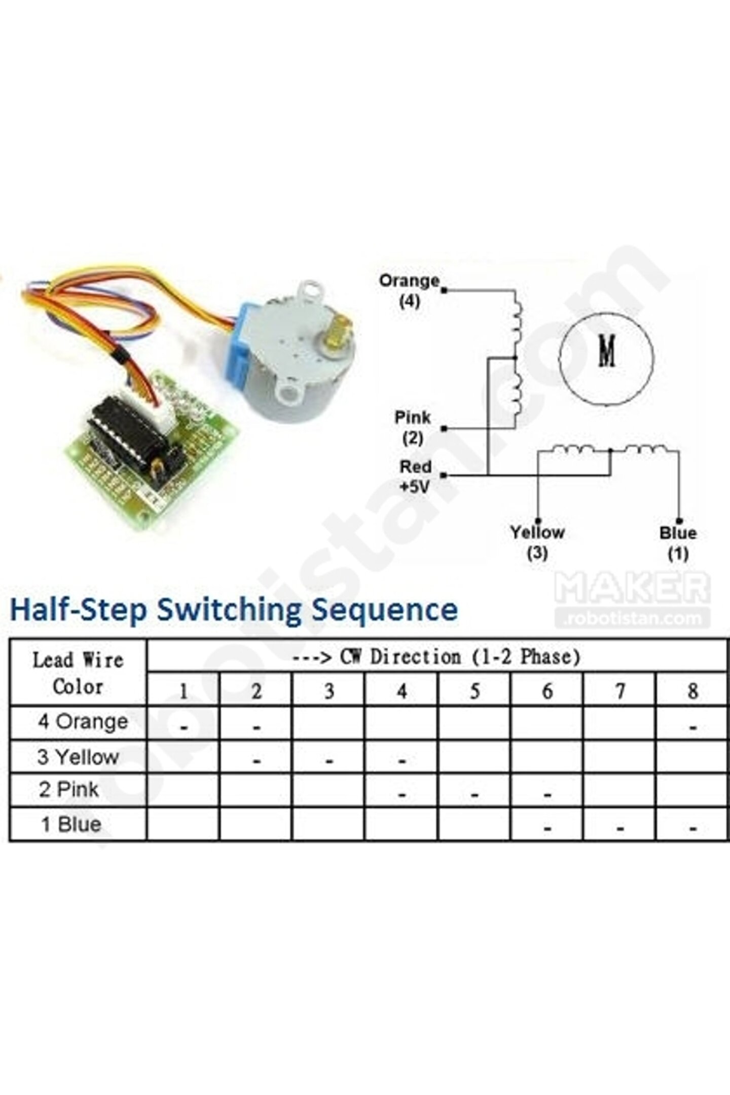 28 BYJ-48 Redüktörlü Step Motor ve ULN2003A Step Motor Sürücü Kartı 28 BYJ-48 5V'luk hobi, robotik ve elektronik projelerde kullanabileceğiniz redüktörlü bipolar step motordur. Step motor sürücü kartı üzerinde 4 led ve 4 kontrol pini bulunmaktadır. Bu pinler sayesinde redüktörlü step motorun sürülmesini, Arduino veya herhangi bir mikrodenetleyeci ile gerçekleştirebilirsiniz. Daha detaylı bilgi sayfa altında yer alan dokümanlar kısmında bulunmaktadır. 28 BYJ-48 Redüktörlü Step Motor Özellikleri: Çalışma Gerilimi: 5V DC; 4 Fazlı; Adım Açısı 5.625°/64; Frekans: 100 Hz; Direnç: 130 Ohm;