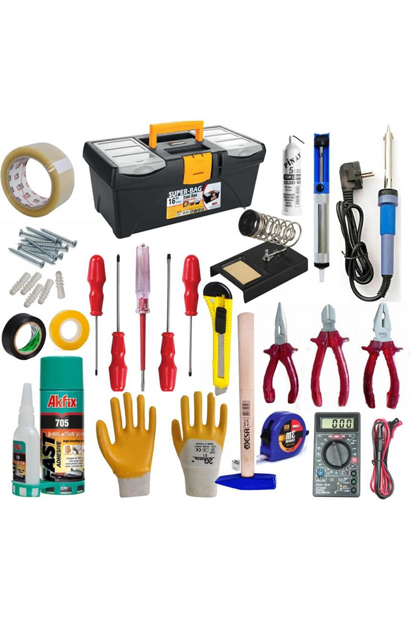 USTA TAKIM ÇANTASI 1; 1 adet 16" Takım Çantası 2; 1 adet Tudor 60W Kalem Havya 3; 1 adet Tüp Lehim Teli 1,2mm 4; 1 adet Havya Standı; Havya Sehpası 5; 1 adet Lehim Pompası 6; 1 adet DT830D Dijital Multimetre 7; 1 adet Yıldız Tornavida 5x100 mm 8; 1 adet Düz Tornavida 5x100 mm 9; 1 adet Yıldız Tornavida 4x100 mm 10; 1 adet Düz Tornavida 4x100 mm 11; 1 adet Kontrol Kalemi 12; 1 adet Yan Keski 160 mm 13; 1 adet Karga Burun 160 mm 14; 1 adet Pense 180 mm 15; 1 adet Akfix Çok Amaçlı Hızlı Yapıştırıcı Seti 705 200 ml/50 gr 16; 1 adet Şerit Metre (3 Metre) 17; 1 adet Çekiç 300 gr 18; 1 adet Eldeven 19; 1 adet Maket Bıçağı (Falçata) 20; 1 adet İzole bant 21; 1 adet Koli bandı 22; 1 adet Şeffaf bant 23; 10 adet 4x50 mm Sunta Vidası 24; 10 adet 3,5x30 mm Sunta Vidası 25; 10 adet 3,5x18 mm Sunta Vidası 26; 10 adet Dübel;