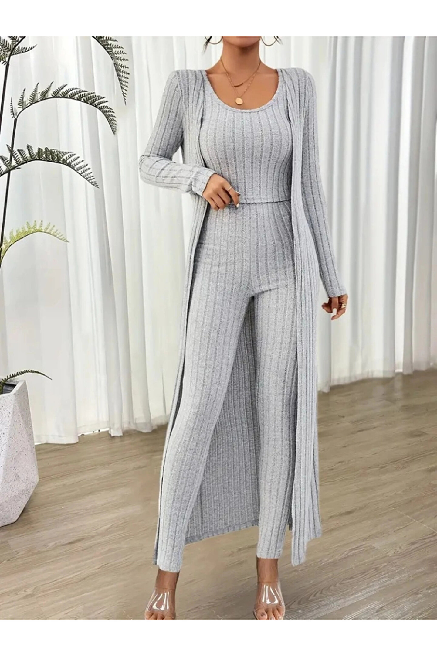 Kadın Yuvarlak Yaka Askılı Krop Bluz Yüksek Bel Tayt Ve Uzun Hırka şardonlu Kaşkorse üçlü Takım