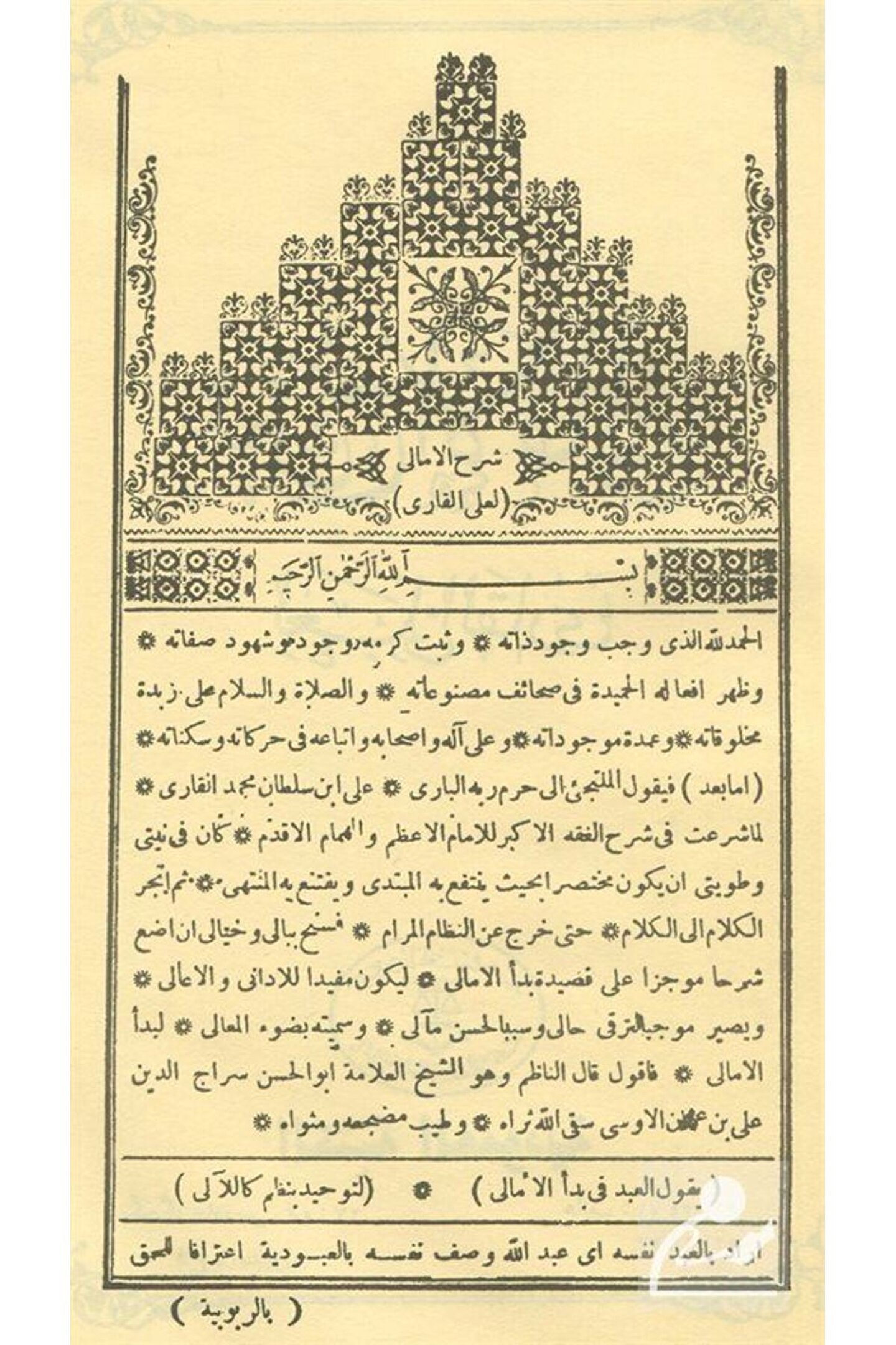 Şerhu'l-Emali (Arapça Akide) Aliyyu'l-Kari / El Mektebetül Mahmudiyye Basım Yılı: 2019; Baskı: 1; Sayfa Sayısı: 48; Kağıt Türü: Şamuha Kağıt; Ebat: 16 x 23; Dil: Türkçe; Cilt Durumu: Karton Kapak; ISBN: 0000014813; Yazar: Aliyyu'l-Kari; Ali b. Osman el-Ûşî Hazretlerinin akâide dâir nazım hâlinde yazmış olduğu Emâlî kasîdesine Aliyyü'l-Kârî Hazretleri tarafından yapılan en meşhur şerhtir. Bu şerhte metinlerin tek tek kelime manaları üzerinde durulmuş ve umumi olarak ihtivâ ettiği manalar îzah edilmiştir. Metinde ifâde edilen akâid kâidelerinin delilleri bir bir kaydedilmiş fırak-ı dâlle ve inkarda ısrar edenlere gereken cevaplar verilmiştir.