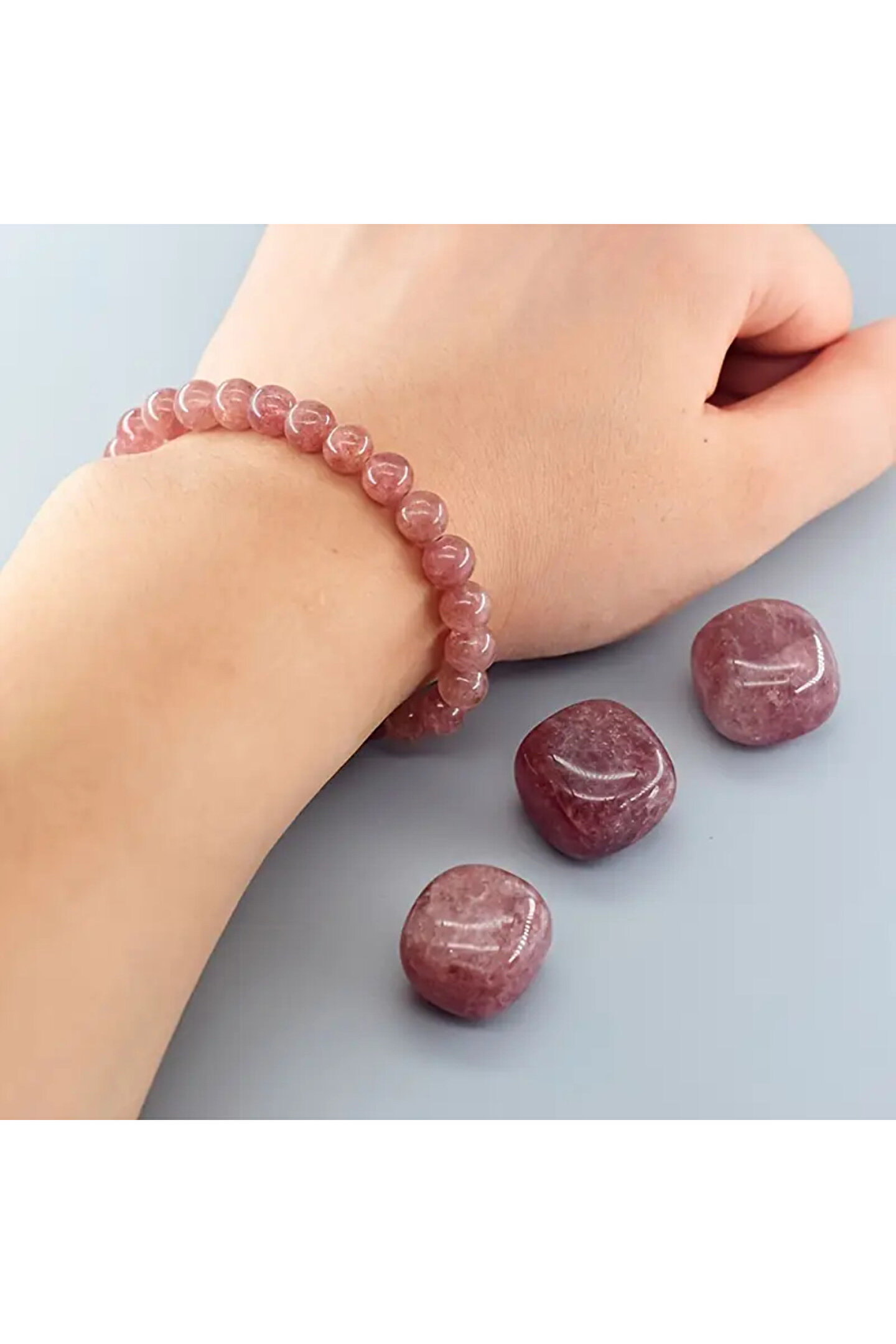 EL YAPIMI Şifalı - Çilek Kuvars Doğal Taş Bileklik 6 mm – Sevgi ve Pozitif Enerji Taşı - Elastik ipli
