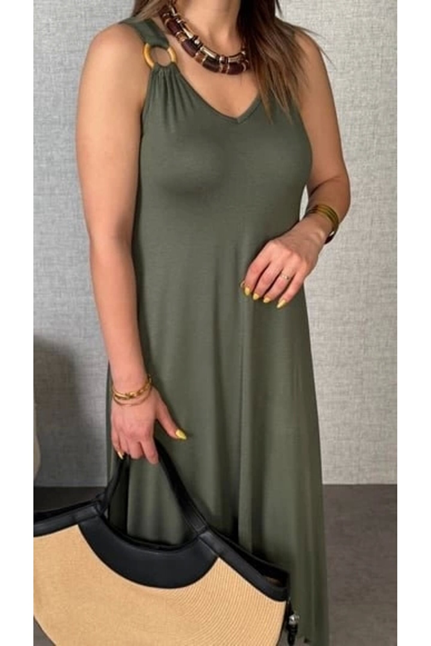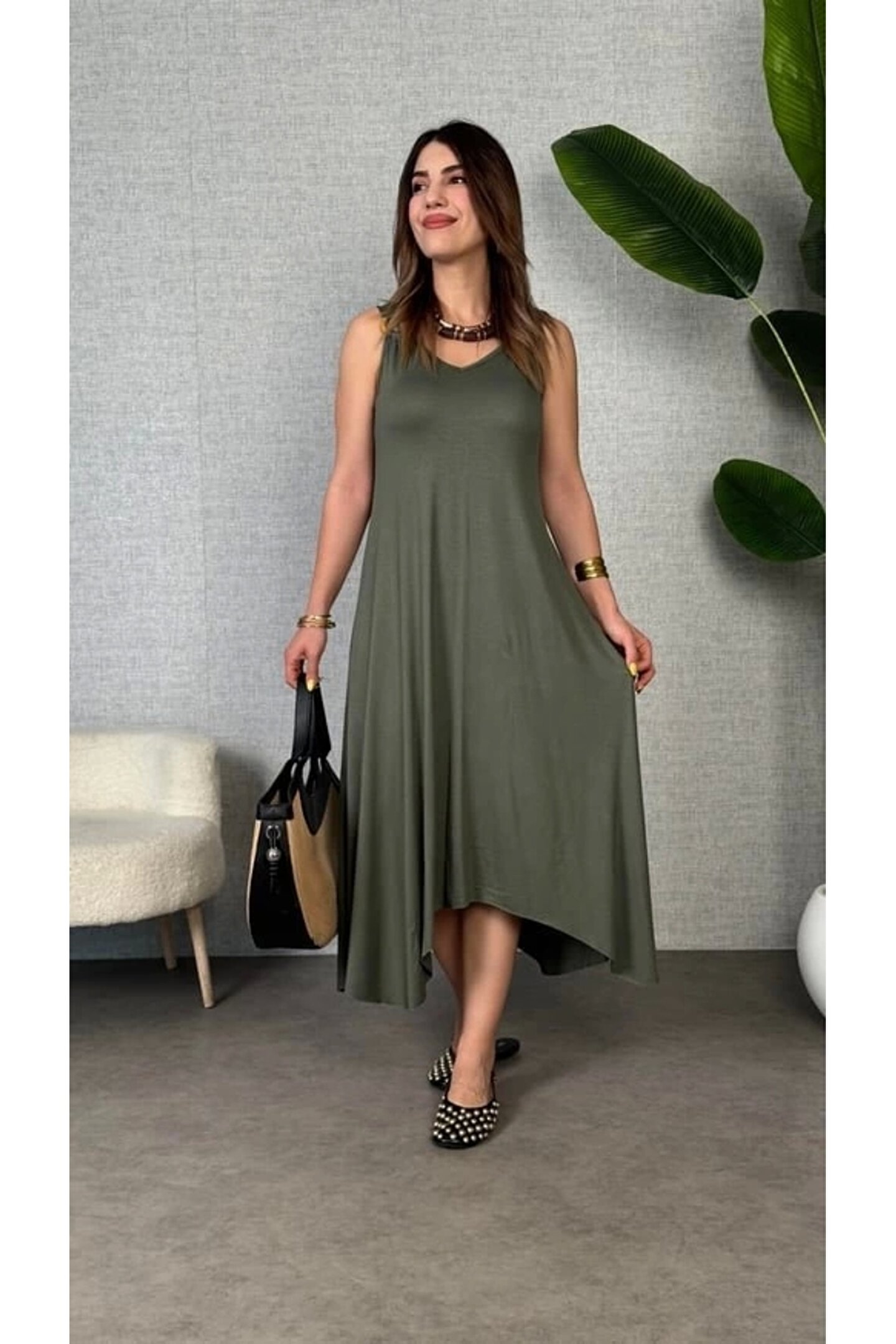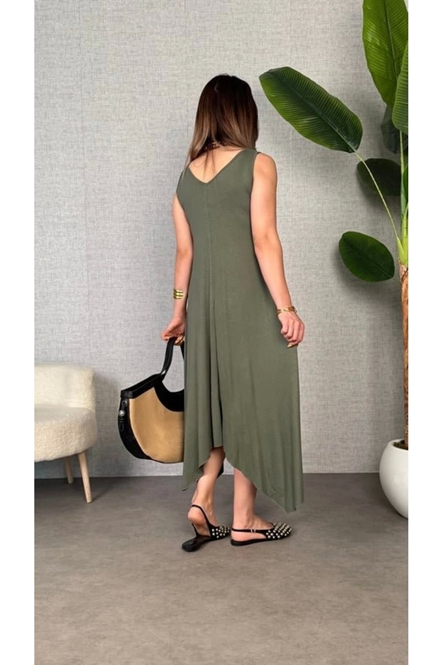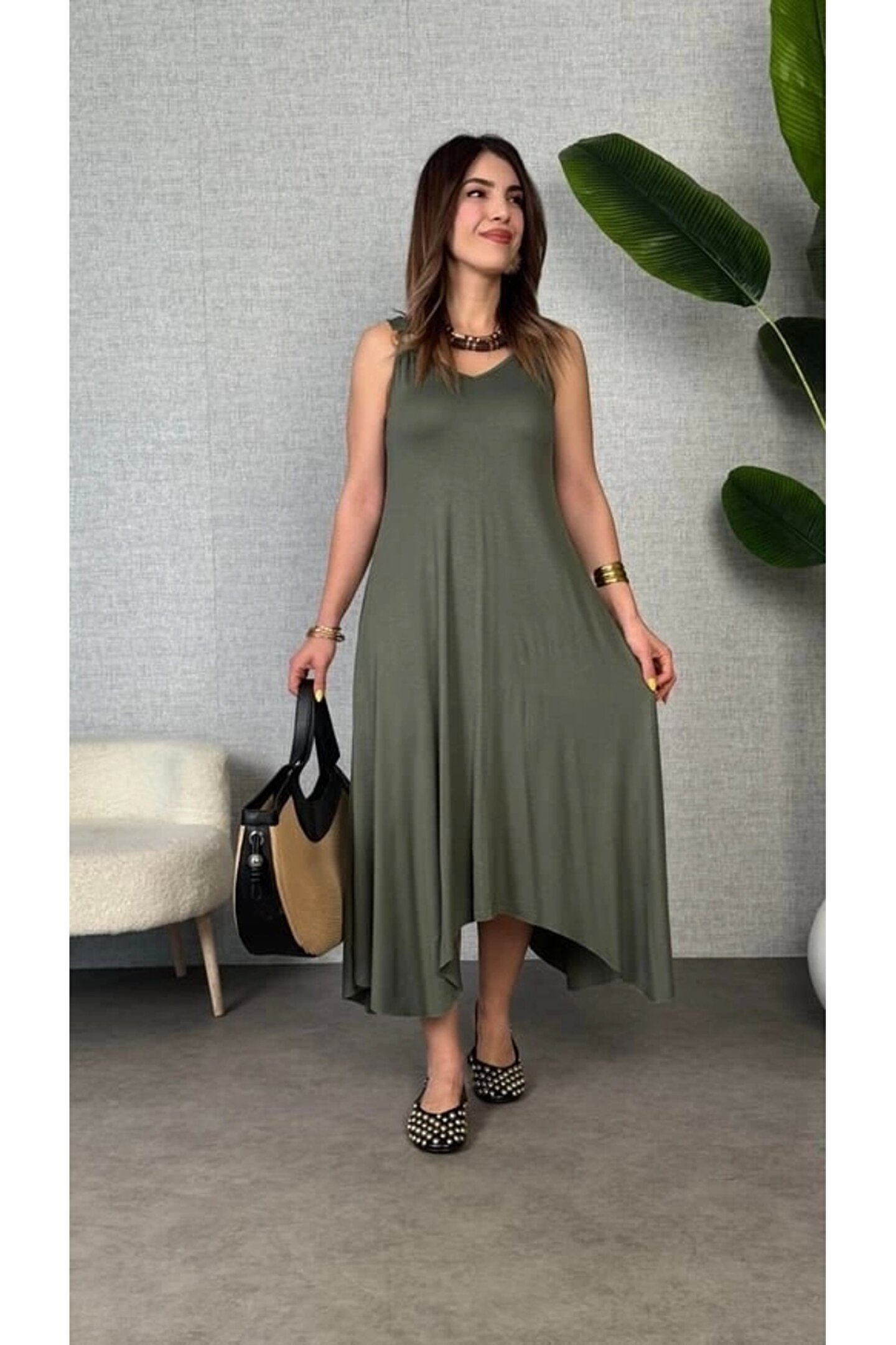 Kadın çan Dokuma Kumaş V Yaka Asimetrik Kesim Elbise