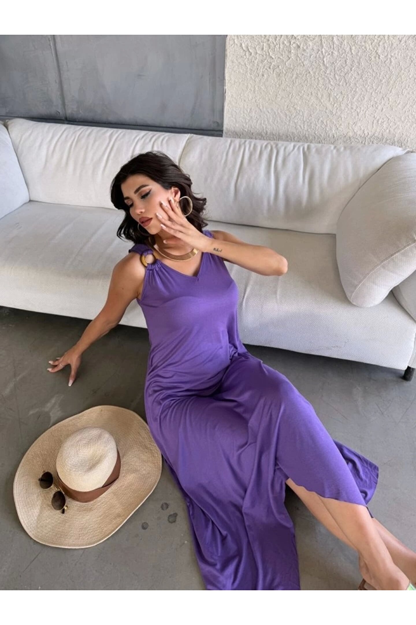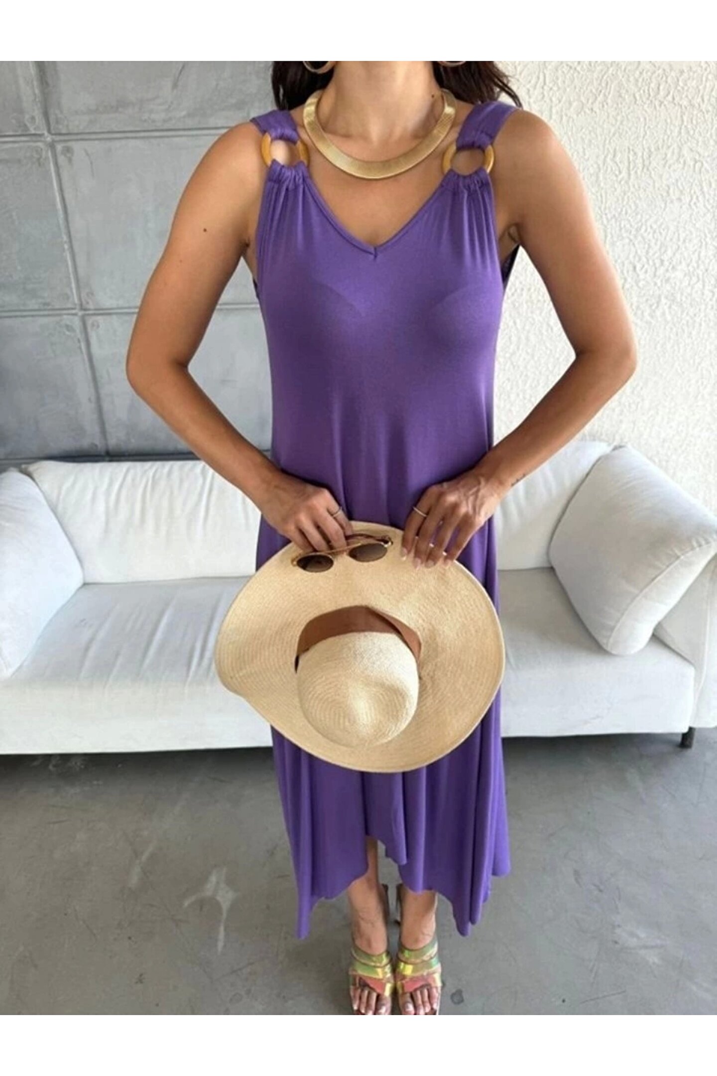 Kadın çan Dokuma Kumaş V Yaka Asimetrik Kesim Elbise