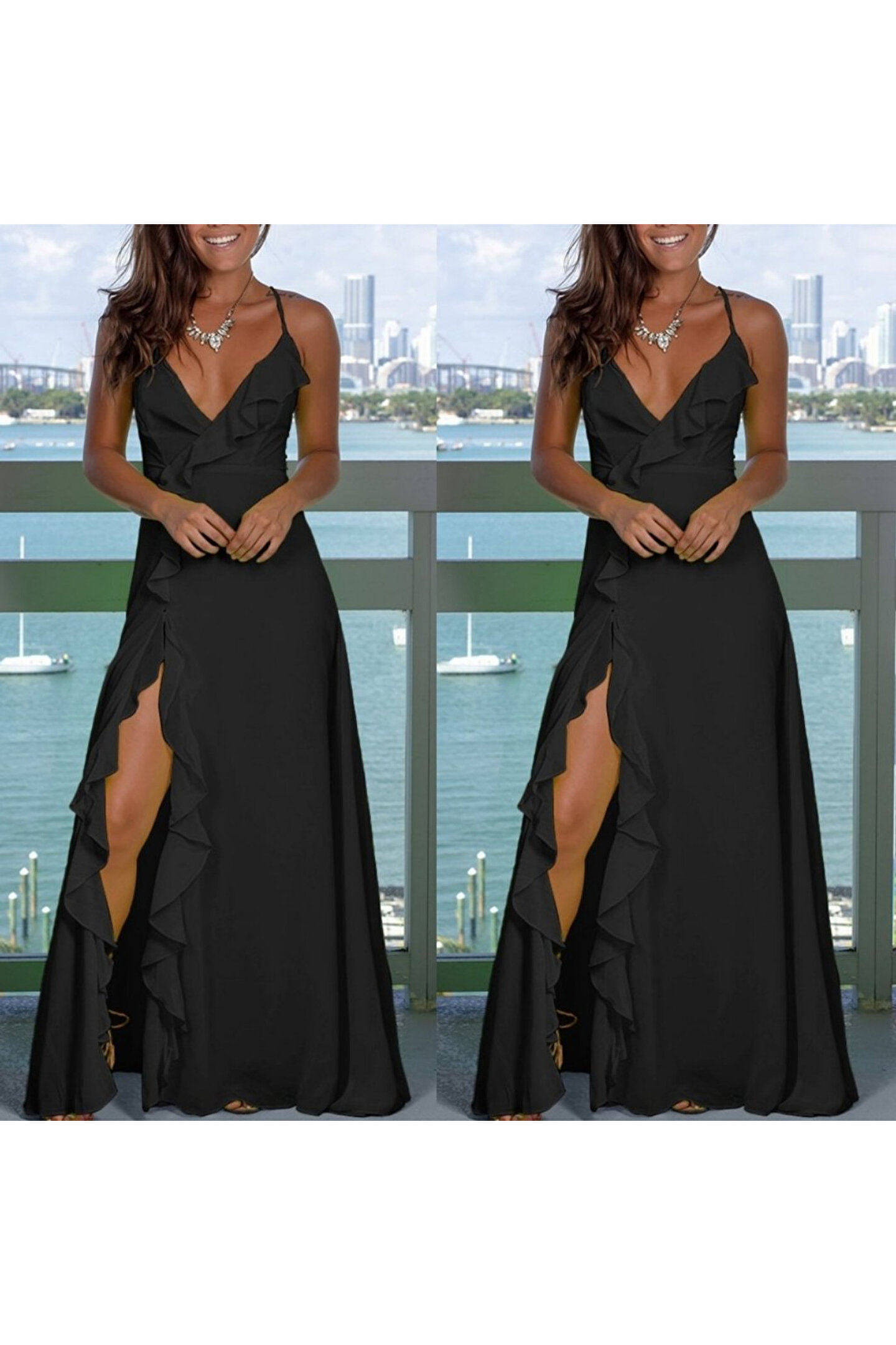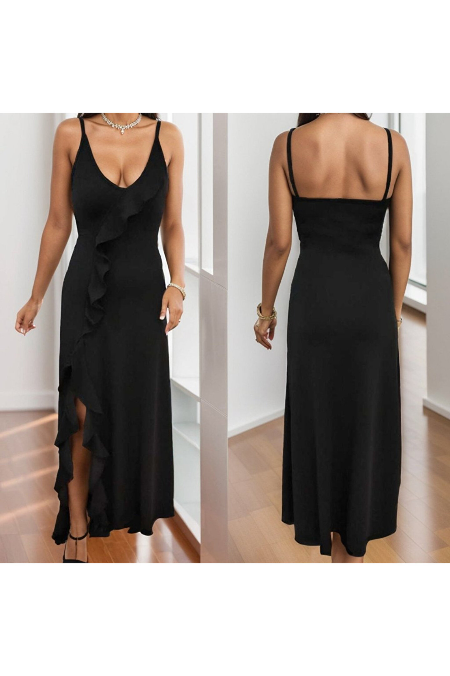 Kadın Ip Askılı Dekolteli Yırtmaç Detay Krep Elbise