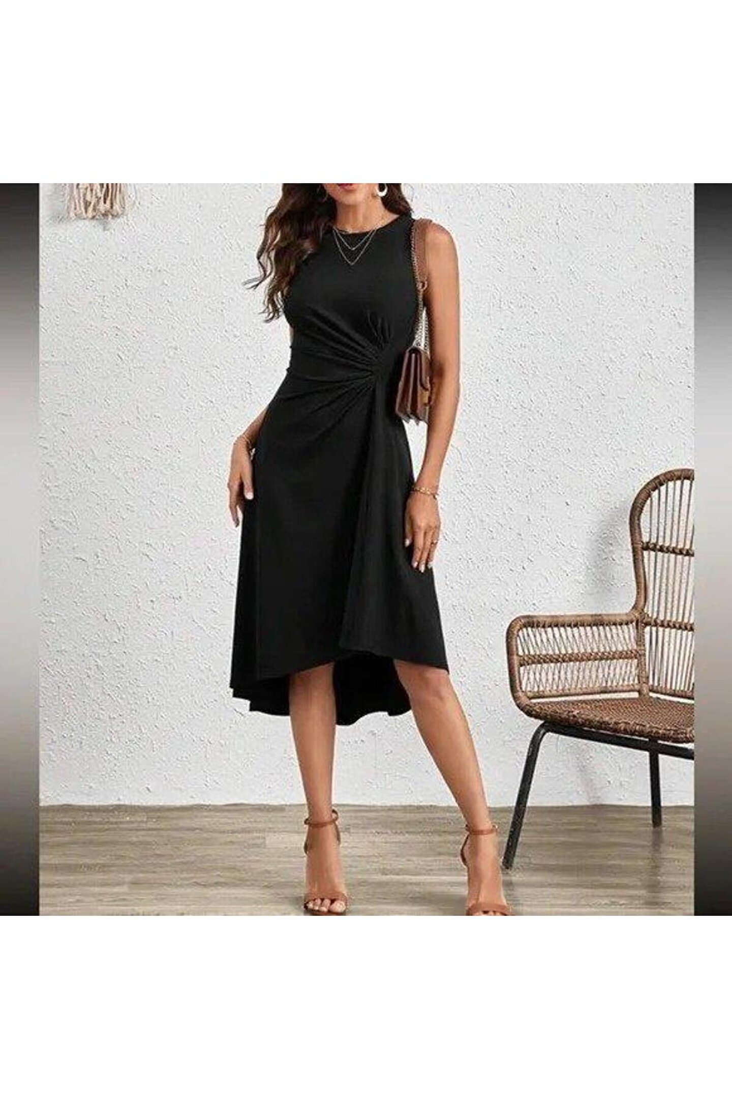 ELEVA FEMME Kadın Sıfır Kollu Bisiklet Yaka Büzgülü Asimetrik Kesim Detaylı Janjan Krep Elbise