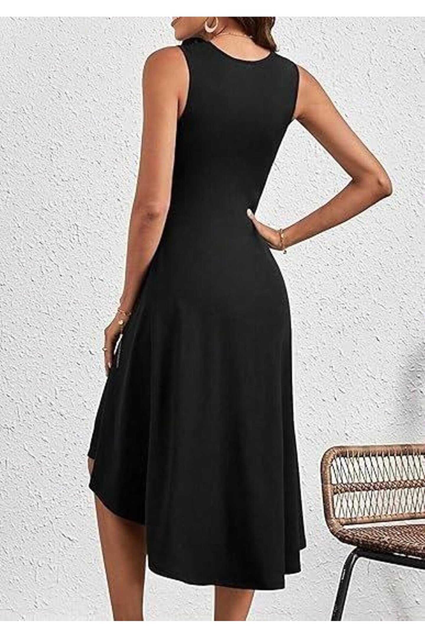 Kadın Sıfır Kollu Bisiklet Yaka Büzgülü Asimetrik Kesim Detaylı Janjan Krep Elbise