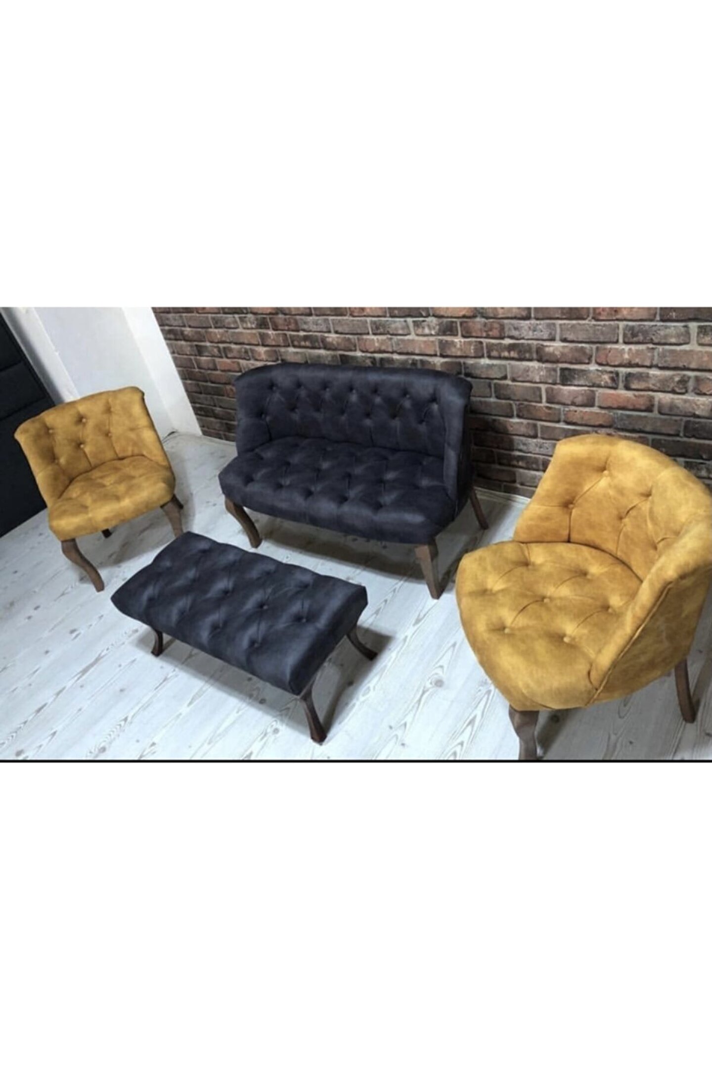 2 adet tekli, 1 adet ikili ve 1 adet bench banktan oluşan takımın parçaları; oturma yüksekliği olarak 45 cm ölçülerinde tasarlanır. Bununla beraber ikilisinin genişliği 120 cm ve teklisinin genişliği 60 cm şeklinde sunulur.; Koltuk takımının gövdesi, son derece yüksek bir kaliteye sahip olan ahşap malzeme aracılığıyla tamamlanır. Bu sayede dayanıklılığı artırılan model uzun ömürlü bir kullanım vadeder.; Model sabit fonksiyonlu olup, pek çok farklı noktada kullanıma elverişli yapı sergiler. Konfor olarak ideal yapısı da çeşitli noktalarda konumlandırılmasına katkıda bulunur.; Nemli bir bezle silinebilen kumaş yapısı ilk günkü görünümünü ve formunu korumayı sürdürür.; Modern ve şık yapısıyla beğenileri toplayan çay seti, evlerinizin farklı noktalarında rahatlıkla dekorasyonlarınıza dahil edilebilir. Başta mutfak, salon, yemek ve yatak odası gibi alanlar olmak üzere isteğinize göre balkon, bahçe ve teras gibi ortamlarınıza da uyum gösterir.; Modelin evler ile beraber iş yeri ve ofis dizaynlarında da tercih edilmesi mümkün olur. Çalışma ortamlarınızın odak noktasında yer alabileceği gibi bekleme alanı gibi bölgelerde de konfor beklentilerini karşılar.; Açık alanlarda kullanıldığında doğrudan güneş ışığı ve diğer hava koşullarına maruz bırakılmaması, kullanım ömrü bakımından önem taşır.;