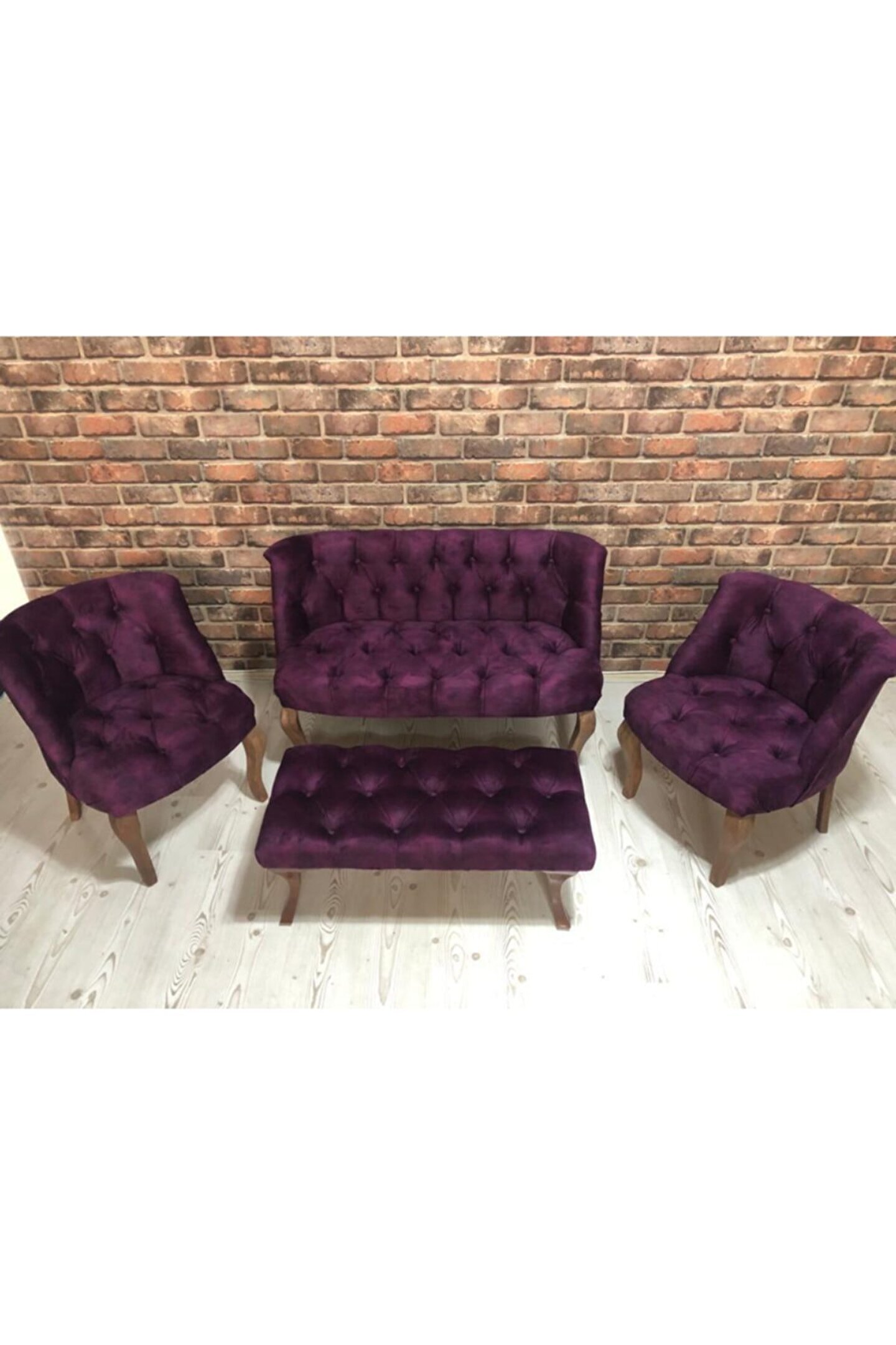 Mürdüm mor renk tonlarıyla dikkat çeken bu şık oturma grubu, bahçenizde veya balkonunuzda modern bir atmosfer yaratır.; Ahşap malzemesiyle dayanıklı ve uzun ömürlü kullanım sunar; dış mekan koşullarına karşı dirençlidir.; İki adet berjer ve bir adet koltuktan oluşan takım, farklı oturma ihtiyaçlarınıza uyum sağlar ve konforlu bir dinlenme alanı oluşturur.; Modern tasarımı ve zarif görünümüyle evinizin dış mekan dekorasyonuna estetik bir dokunuş ekler.; Kolay temizlenebilir yapısıyla pratik kullanım sunar; yağmur veya toz gibi dış etkenlere karşı dayanıklıdır.; Şık tasarımıyla hem işlevsel hem de estetik açıdan göz alıcı bir dış mekan oturma grubu arayanlar için idealdir.;