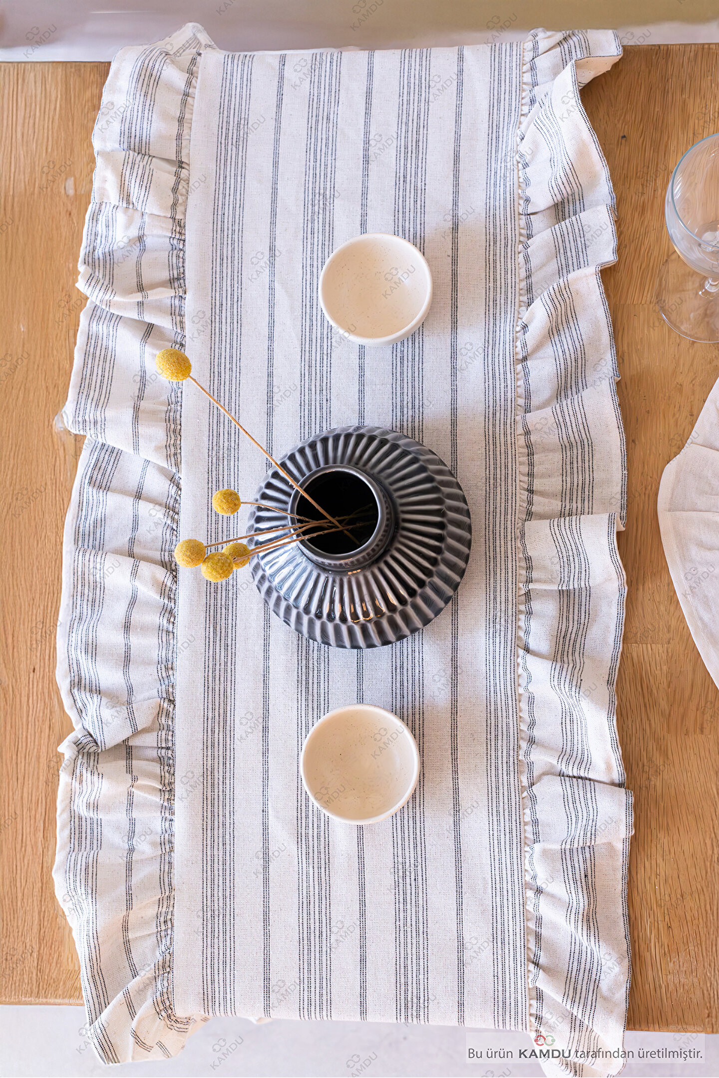 - %100 keten pamuktan üretilmiş, dayanıklı ve uzun ömürlü kullanım sunar.; - Vintage fırfırlı tasarımı ile mekanınıza nostaljik bir hava katar.; - 30 derecede yıkanabilir olması sayesinde kolayca temizlenebilir ve bakımı pratiktir.; - Dikdörtgen formu ile çeşitli masa boyutlarına uyum sağlar ve şık bir görünüm oluşturur.; - 40 x 125 cm ölçülerindeki geniş yüzey alanı, yemek masanızda rahatça kullanılabilirlik sunar.