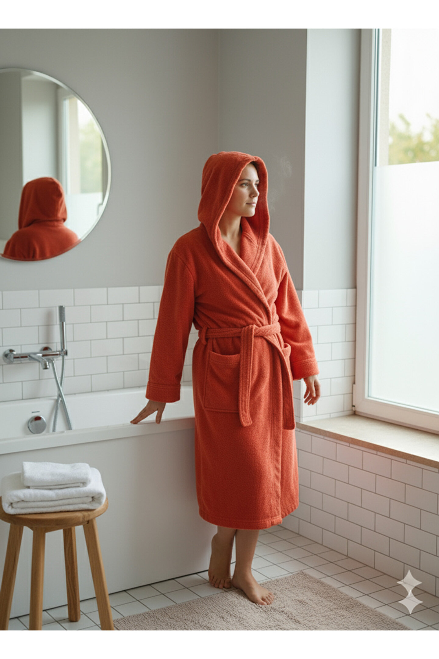 - %100 pamuklu kumaştan üretilmiş olup, cildinize nefes aldırarak konforlu bir kullanım sunar.; - Unisex tasarımıyla hem kadınlar hem de erkekler için uygun, herkesin rahatlıkla tercih edebileceği bir üründür.; - Kapüşon detayı sayesinde baş ve boyun bölgesini sıcak tutarak rahat bir kullanım sağlar.; - Cepli yapısı küçük eşyalarınızı yanınızda taşımanız için pratik bir çözüm sunar.; - Yetişkinler için ideal boyutta tasarlanmıştır; maxi uzunluğu ile vücudu tamamen sararak maksimum rahatlık sağlar.; - Düz deseniyle sade ve şık bir görünüm sergiler, farklı ortamlarda kolayca kombinlenebilir.; - Tekil ürün olarak sunulan bu bornoz, hem evde hem de hamam veya saunada kullanım için idealdir.;