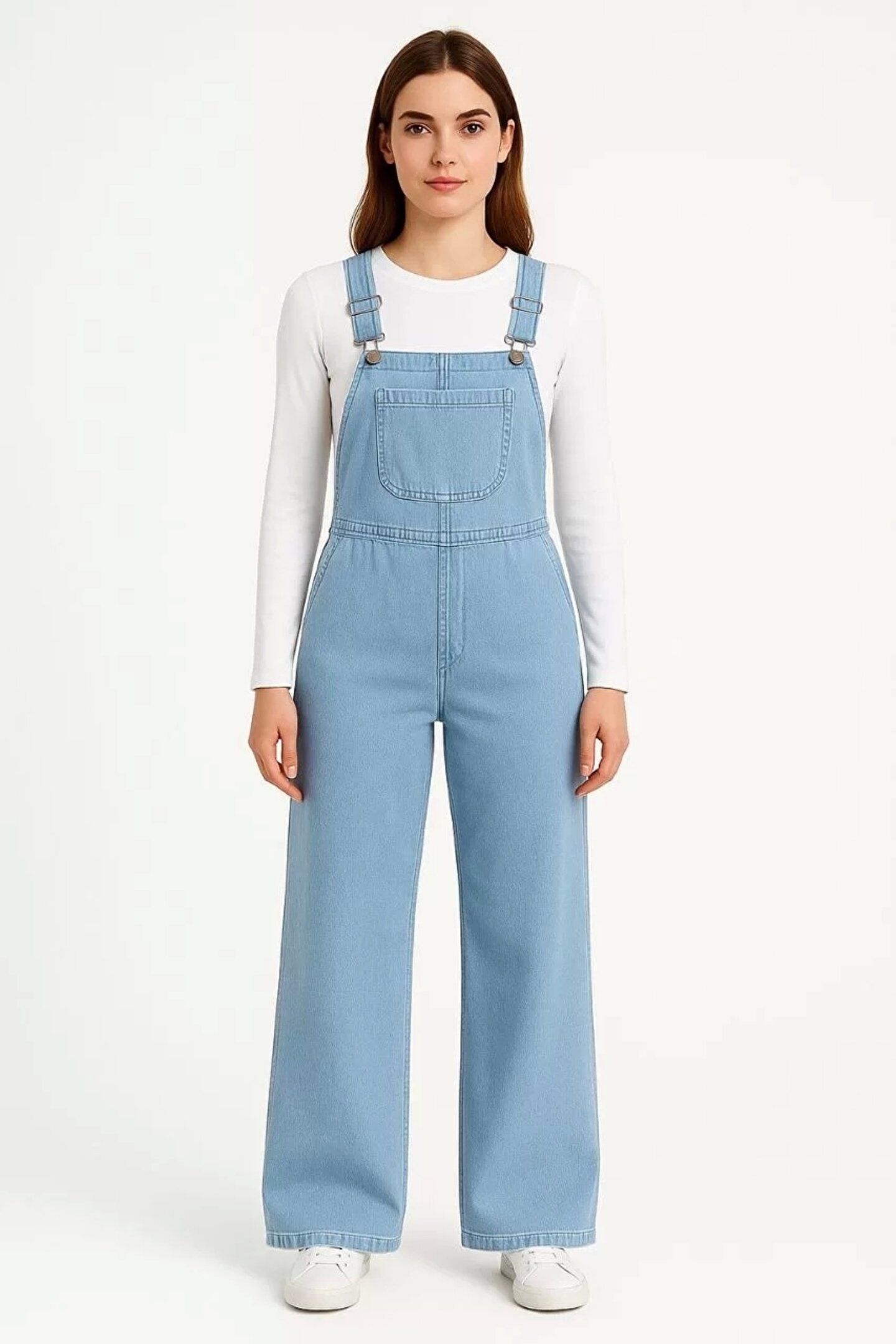 Emu Wear Kadın Chambray Açık Mavi Denim Görünümlü Geniş Paça Salopet Tulum - Mavi