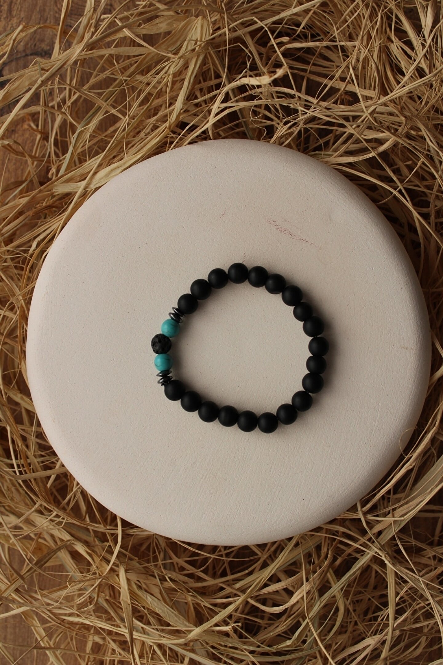 Doğal taş kullanımı sayesinde her bileklik benzersiz ve otantik bir görünüm sunar; Turkuaz, havlit, lav taşı ve oniks gibi farklı doğaltaşların birleşimiyle zenginleştirilmiş tasarım, şıklığınızı tamamlar; Hematit taşı ile zenginleştirilmiş bu bileklik, enerjiyi yansıtan ve pozitif titreşimleriyle dikkat çeker; Doğal taşların zarif dokusu, her türlü kıyafetle uyum sağlayarak stilinizi öne çıkarır;