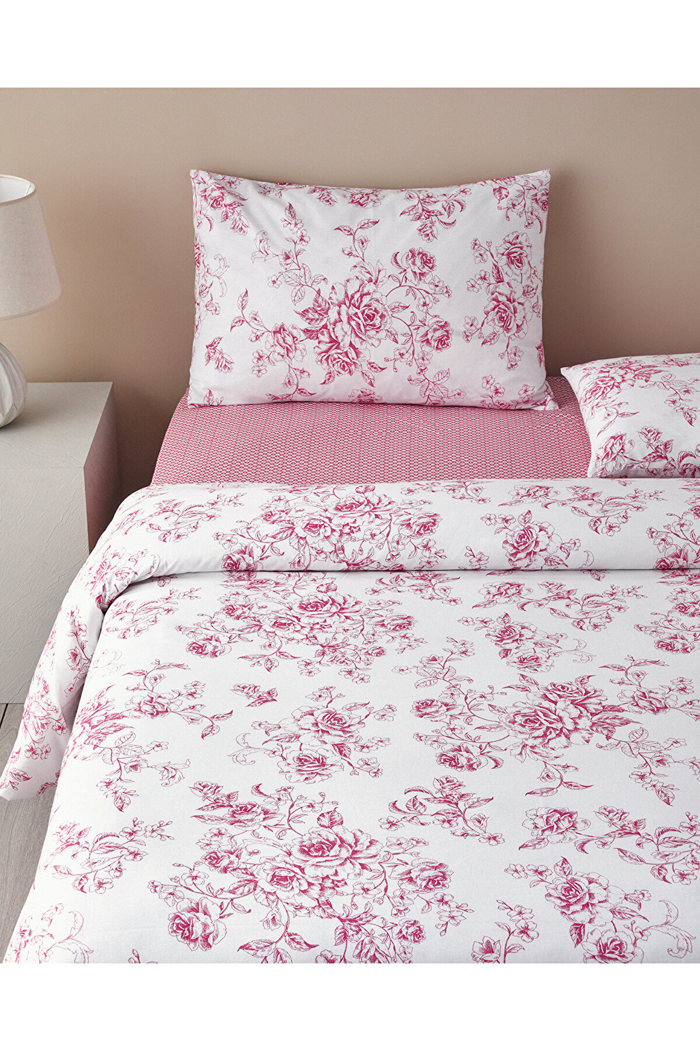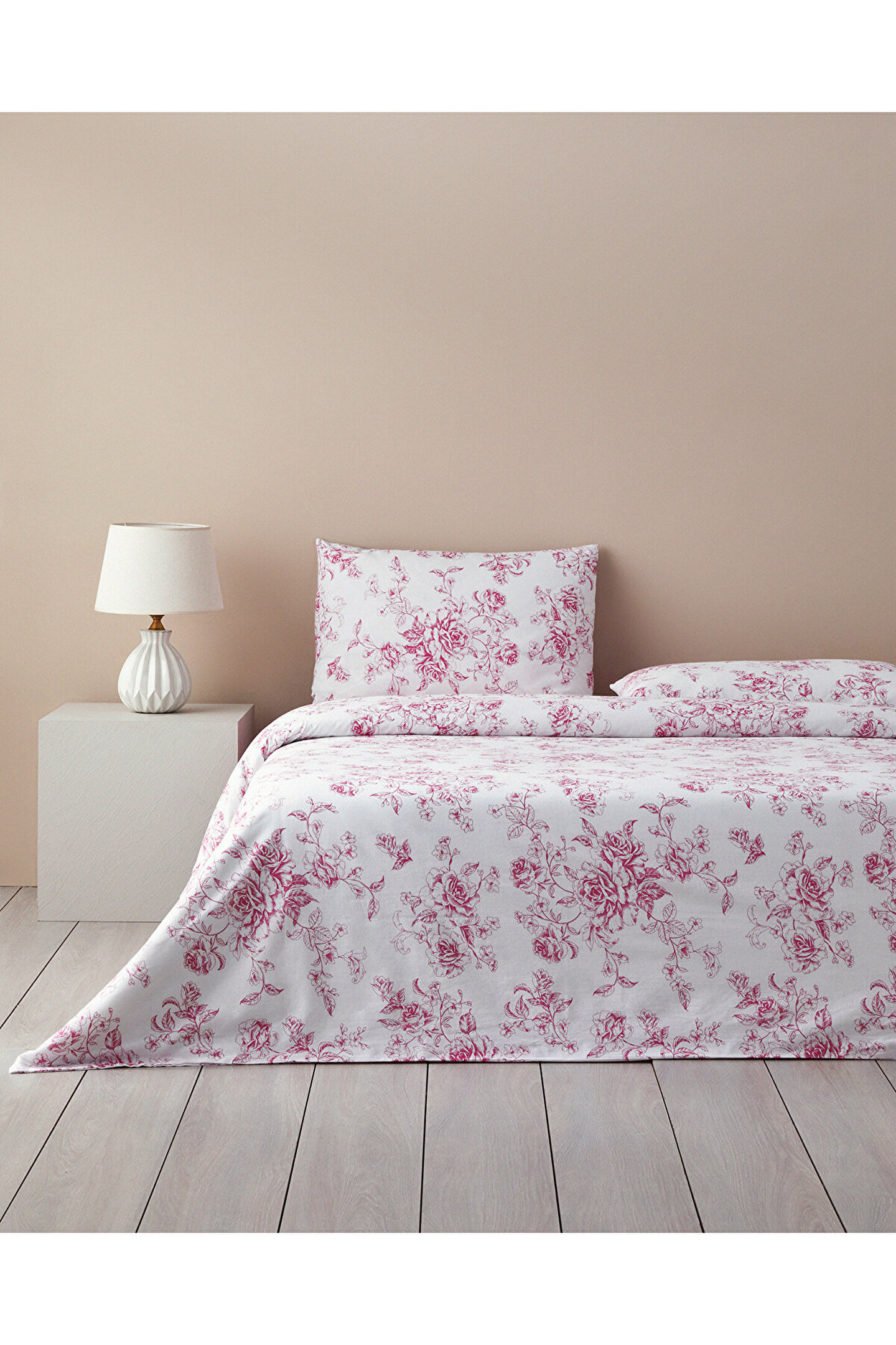 Yumuşak dokunuşuyla konforlu bir uyku deneyimi sunan pamuklu materyalden üretilmiştir.; Çift kişilik boyutunda tasarlanan nevresim takımı, geniş ve rahat bir yatak alanı sağlar.; Lastikli çarşaf özelliği sayesinde kolayca yatağa sabitlenir ve kaymaz, böylece gece boyunca mükemmel uyku pozisyonunuzu korursunuz.; Zarif pembe tonlarıyla dikkat çeken çiçekli deseniyle, yatak odanızda romantik ve huzurlu bir atmosfer yaratır.; Kolay bakım imkanı sunan pamuklu materyali sayesinde uzun süreli kullanım için idealdir.;