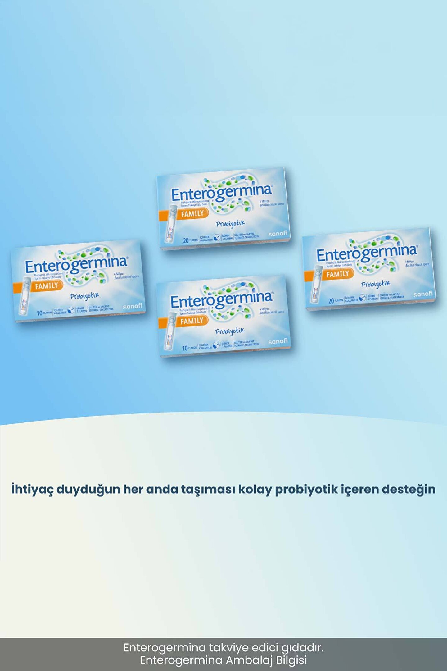 Ürün Bilgileri: Enterogermina Aile 10 Flakon Enterogermina Nedir?: Probiyotik mikroorganizma (4 Milyar Bacillus Clausii sporu) içeren takviye edici gıdadır.; Enterogermina’nın Farkı Nedir?: Canlı spor içeren bir probiyotiktir.; Spor, bakterinin kendisini korumaya almış halidir.; Enterogermina'nın içerisindeki Bacillus clausii bakterisi, doğal olarak spor yapma özelliğine sahiptir.; Bu sporlar, midedeki asidik ortam bariyerini aşarak bağırsağa ulaşır.; Bağırsakta uygun ortamı yakalayarak canlı hale dönüşür ve çoğalmaya başlar (kolonize olur).; Bu şekilde faydalı etkilerini gösterir.; Enterogermina flakon formda olduğu için direkt ağıza dökerek tüketilebilir.; Tatsız ve kokusuz Enterogermina’nın içerisinde sadece su ve probiyotik bulunur, koruyucu hiçbir katkı maddesi içermez.; Bacillus Clausii Nedir?: İnsan sağlığı üzerinde pozitif etkiler yaratan bir bakteri türüdür.; Sindirim sistemini düzenlemeye, bağışıklık sistemini desteklemeye yardımcı olur.; Hastalığa yol açabilecek çeşitli bakterilerin büyümesini kısıtlayan maddeleri sentezleyebilen bir mikroorganizmadır.; Ayrıca, antikorların (bağışıklık proteini) çoğalmasını sağlayarak bağışıklık sistemini de etkilemektedir.; Vücudumuzdaki bazı vitaminlerin sentezlenmesine yardımcı olur.; Sindirim Sistemini Düzenlemeye ve Bağışıklık Sistemini Desteklemeye Yardımcı Olur: Bağırsak mikrobiyotasının dengesi her insanda farklıdır.; Yaşa göre değişir, dinamiktir ve denge durumundadır.; Bu denge çok çeşitli sebeplerden etkilenebilir: *Kullandığınız ilaçlar, *Yetersiz beslenme, ani sıcaklık değişiklikleri, *Seyahat, çevre kirliliği, hormon kullanımı, stres gibi durumlar hassas olan mikrobiyota dengesini bozabilir.; Enterogermina, içeriğindeki probiyotik mikroorganizmalar ile sindirim sisteminizi düzenlemeye ve bağışıklık sisteminizi desteklemeye yardımcı olur.; Enterogermina Kullanıma Hazır Flakondur: Enterogermina 4 Milyar kullanıma hazırdır.; Çalkalayıp, açıp direkt tüketebilirsiniz.; Enterogermina Koruyucu Katkı Maddesi İçermez: Enterogermina 4 Milyar içerisinde sadece saf su ve bacillus clausii sporlu bakterileri bulunur.; Koruyucu katkı maddesi içermez.; En Sık Kullanılan Antibiyotiklere Karşı Dirençlidir: Enterogermina’nın içerisindeki bakteri sporları en sık kullanılan antibiyotiklere karşı da dirençlidir.; Bu sayede antibiyotik kullanımı ile beraber Enterogermina kullanıldığında içerisindeki iyi bakteriler, kullanılan antibiyotikten etkilenmeden faydalı etkilerini gösterebilirler.; Kimler Kullanabilir?: 11 yaş ve üzeri bireylerin kullanımına uygundur.; Hamilelik ve emzirme dönemi ile hastalık veya ilaç kullanılması durumlarında doktorunuza danışınız.; Nasıl Kullanılmalıdır?: Günde 1 flakon (5 ml, 4x109 kob* B.; Clausii) içilir.; Kullanmadan önce flakonu çalkalayınız.; İçilerek kullanılır.; Tavsiye edilen günlük porsiyonu aşmayınız.; *kob: koloni oluşturan birim miktarı Nasıl Saklanmalıdır?: Spor formda oluşu, Enterogermina’ya kullanım ve saklama kolaylığı sağlar.; Buzdolabında saklanması gerekmez ve seyahat ederken ürünü taşımanın bir sakıncası yoktur.; Çocukların ulaşamayacağı yerde saklayınız.; Uyarılar/Önlemler: Takviye edici gıdalar normal beslenmenin önüne geçemez.; Sağlıklı yaşam için dengeli ve çeşitli beslenme önemlidir.; İlaç değildir! Hastalıkların önlenmesi veya tedavi etmesi amacıyla kullanılamaz! İçilerek kullanılır.
