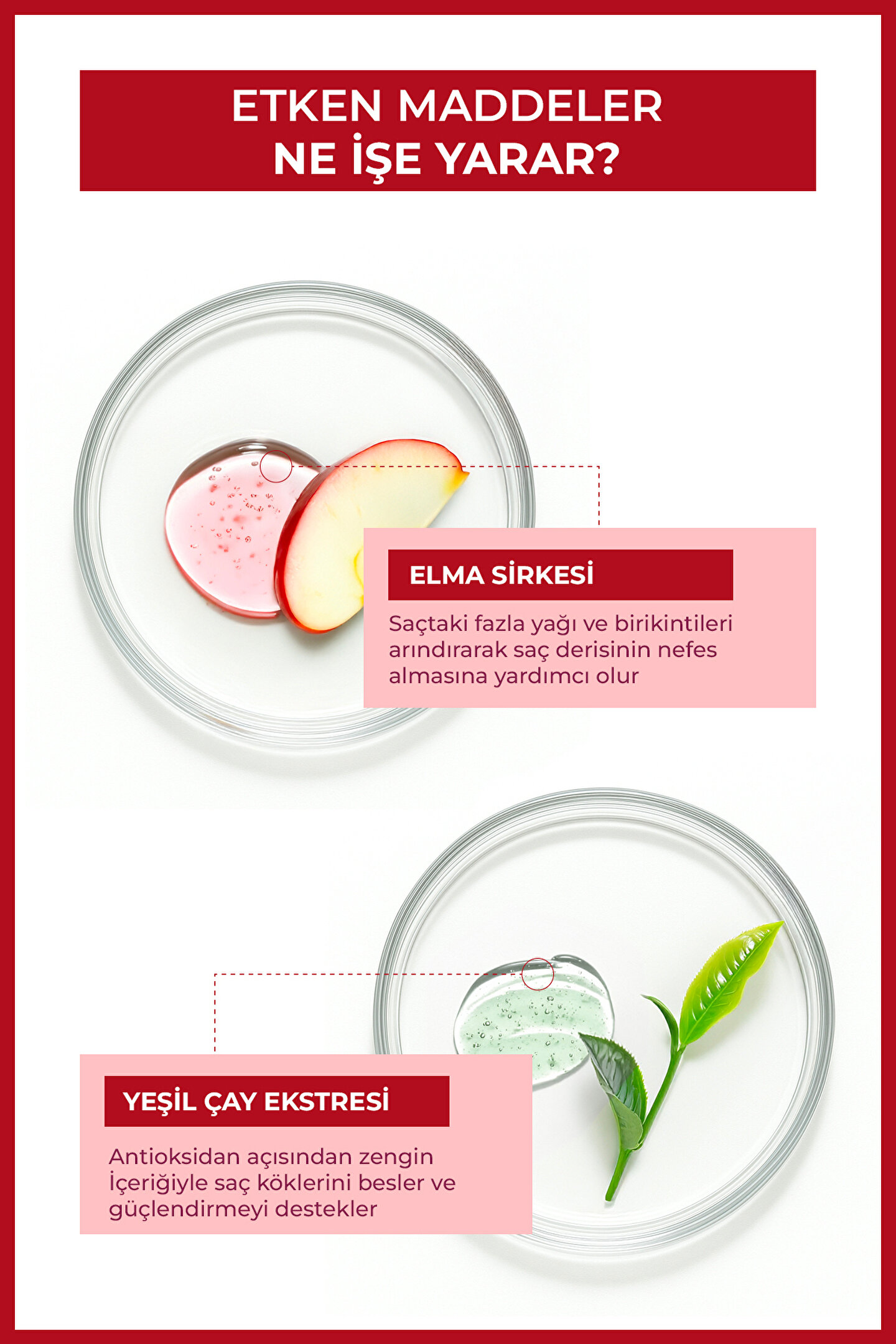 Arındırıcı ve Tazeleyici Formül ; Elma Sirkesi içeriği ile saçlardaki fazla yağı ve kalıntıları arındırarak ferah bir his bırakır.; Yeşil Çay Ekstraktı saçları besleyerek doğal canlılığını korumasına yardımcı olur.; ; İlk Kullanımdan İtibaren Etkili ; Saçları ağırlaştırmadan temizler ve nem dengesini korur.; Saç tellerini besleyerek daha parlak, sağlıklı ve güçlü bir görünüm kazanmasına destek olur.; ; Apple Cider Vinegar ; Saçtaki fazla yağı ve birikintileri arındırarak saç derisinin nefes almasını sağlar.; Saçın doğal pH dengesini koruyarak daha sağlıklı ve parlak görünmesine yardımcı olur.; ; Green Tea Extract ; Antioksidan açısından zengin içeriğiyle saç köklerini besler ve güçlendirir.; Saçı çevresel faktörlere karşı koruyarak daha canlı ve taze bir görünüm kazandırır.; ; Hyaluronic Acid Complex ; Saçın nem dengesini koruyarak kuruluğu önler.; Saç tellerini derinlemesine besleyerek daha dolgun, sağlıklı ve ipeksi bir doku kazandırır.; ; Arındırıcı ; Elma Sirkesi içeriğiyle saçlardaki fazla yağı ve kalıntıları arındırarak saç derisinin nefes almasını sağlar.; ; Tazelik ; Yeşil Çay, saçları besleyerek gün boyu canlı ve taze bir görünüm kazanmasına yardımcı olur.