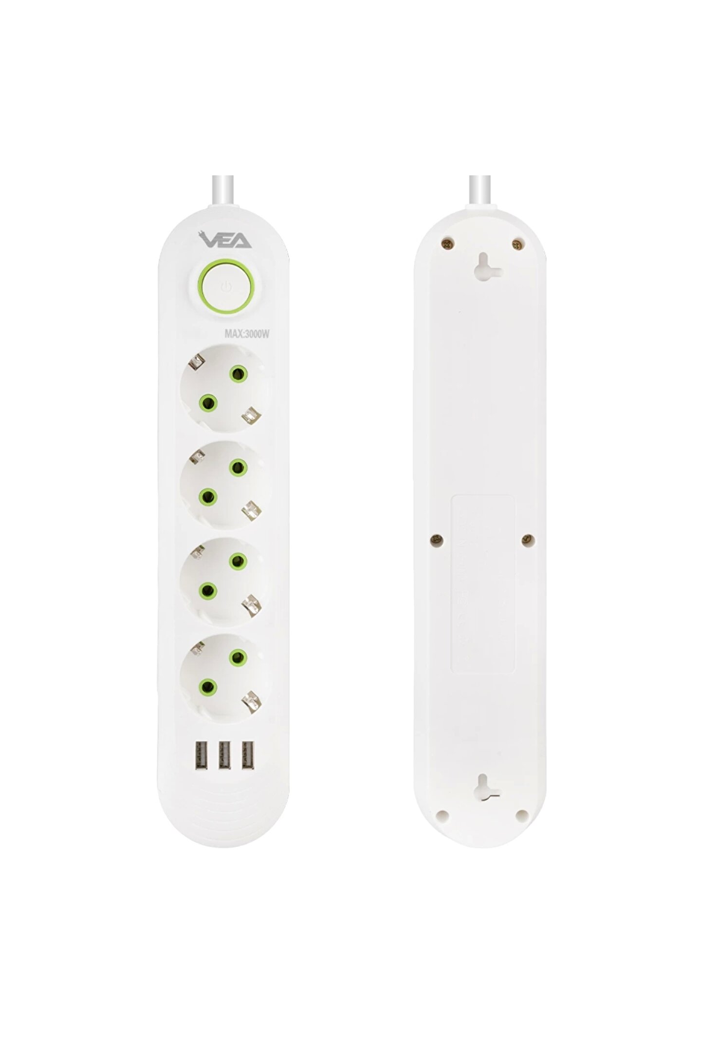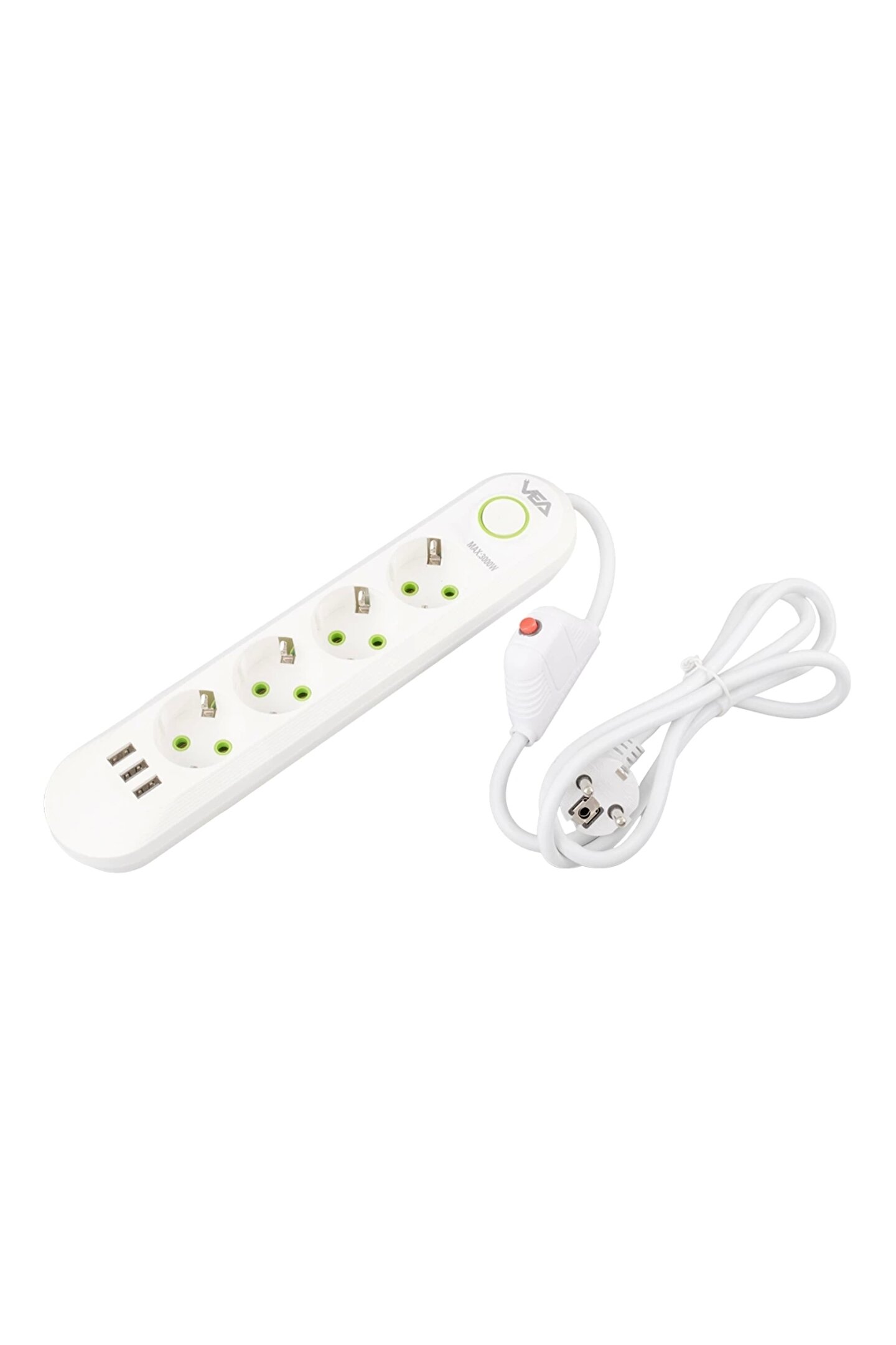 4 Priz ve 3 USB Çıkışı: Vea VA-21560, dört adet priz ve üç adet USB çıkışı ile donatılmıştır, böylece çok sayıda elektronik cihazı aynı anda şarj edebilir veya kullanabilirsiniz. Prizler, geniş aralıklı tasarımı sayesinde farklı priz tiplerine uyum sağlar.