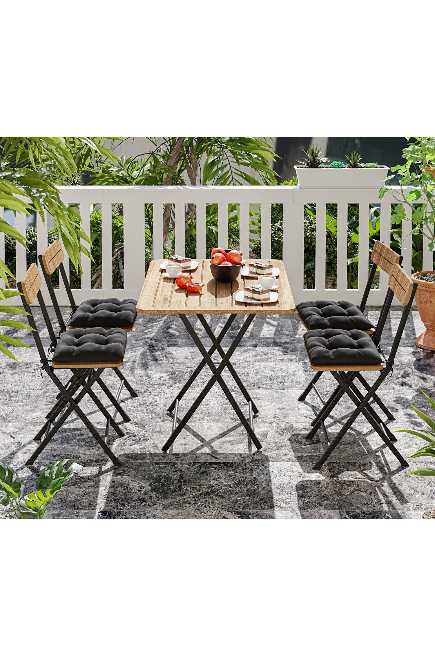 4 kişilik geniş oturma kapasitesiyle, balkon ve bistro set olarak tasarlanmış bu takım, aile yemekleri veya arkadaş toplantıları için idealdir; Dayanıklı çam malzemesi sayesinde uzun ömürlü kullanım sunar ve dış mekan koşullarına karşı yüksek direnç gösterir; Modern ve şık tasarımıyla dikkat çeken bu takım, bahçe dekorasyonunuza estetik bir dokunuş katar; Kolay temizlenebilir yüzeyi ile pratik kullanım sağlar; böylece yemek sonrası temizliği hızlı ve zahmetsizdir;