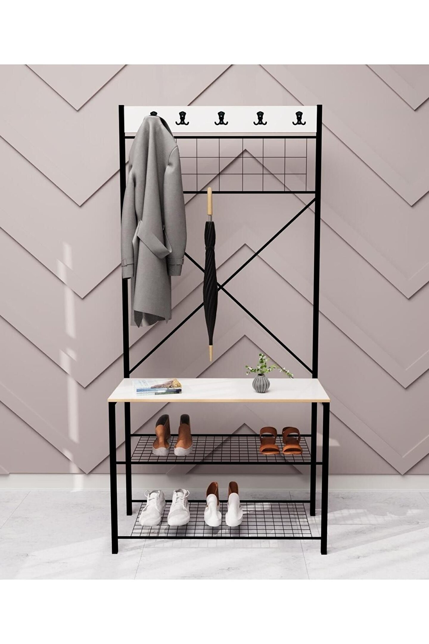 Ürün Ölçüleri: Ürün Genişliği: 80 Cm Ürün Derinliği: 30 Cm Ürün Ayakkabılık Kısım Yüksekliği: 60 Cm Ürün Raf Araları Yüksekliği: 25 Cm Ürün Sırt Yüksekliği: 170 Cm Ürün Özellikleri: Ürün ahşap kısımları 1,8mm kalınlığında suntalamden üretilmiştir . ; Metal kısımları elektrostatik boyalıdır demir malzemeden üretilmiştir, demonte olarak gönderim yapılacaktır. ; Görseldeki diğer ürünler aksesuar amaçlı kullanılmıştır ürün içinde gönderilmeyecektir. ; MDF profil ile oldukça sağlam ve dayanıklı yapıdadır.;