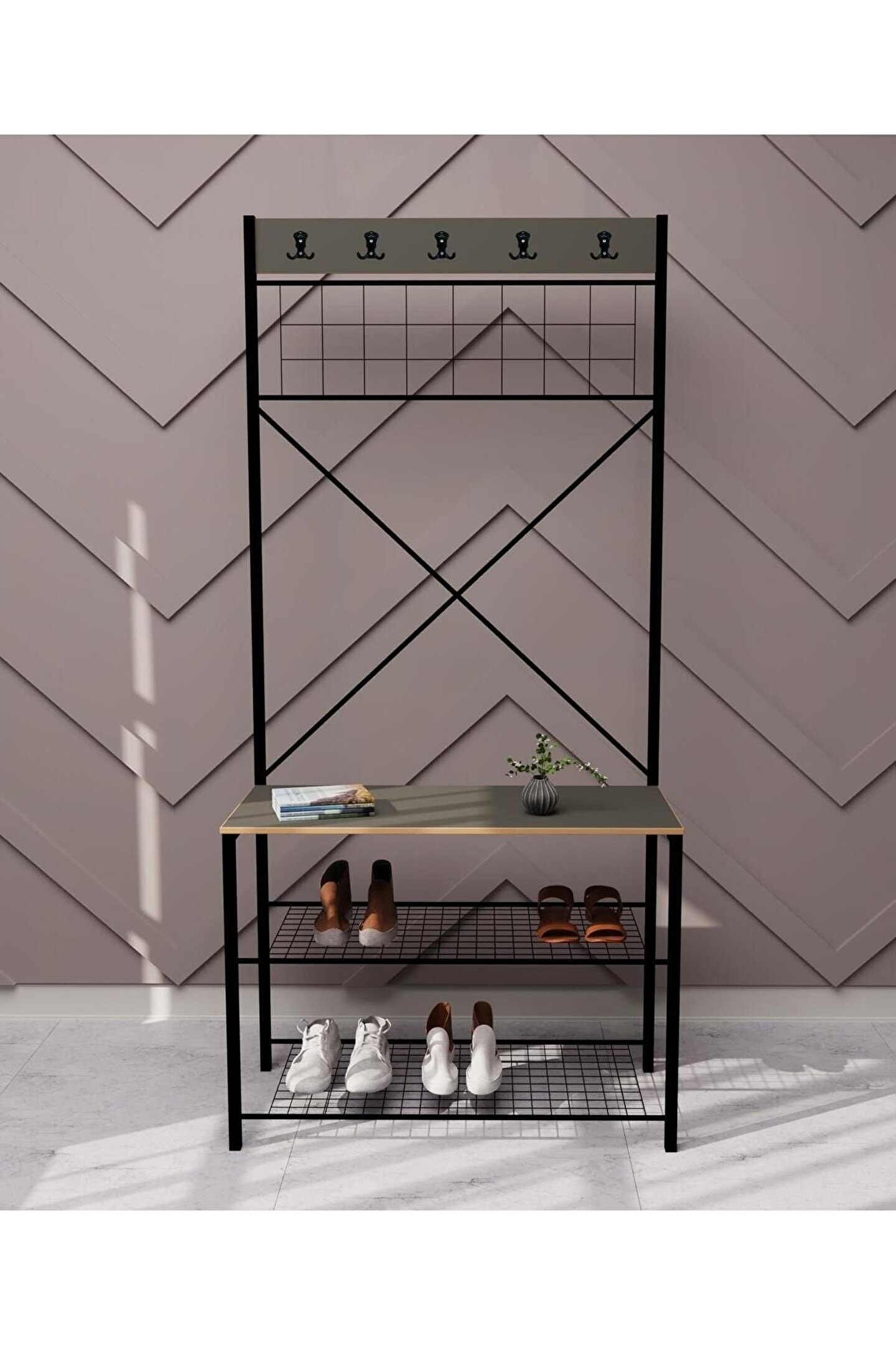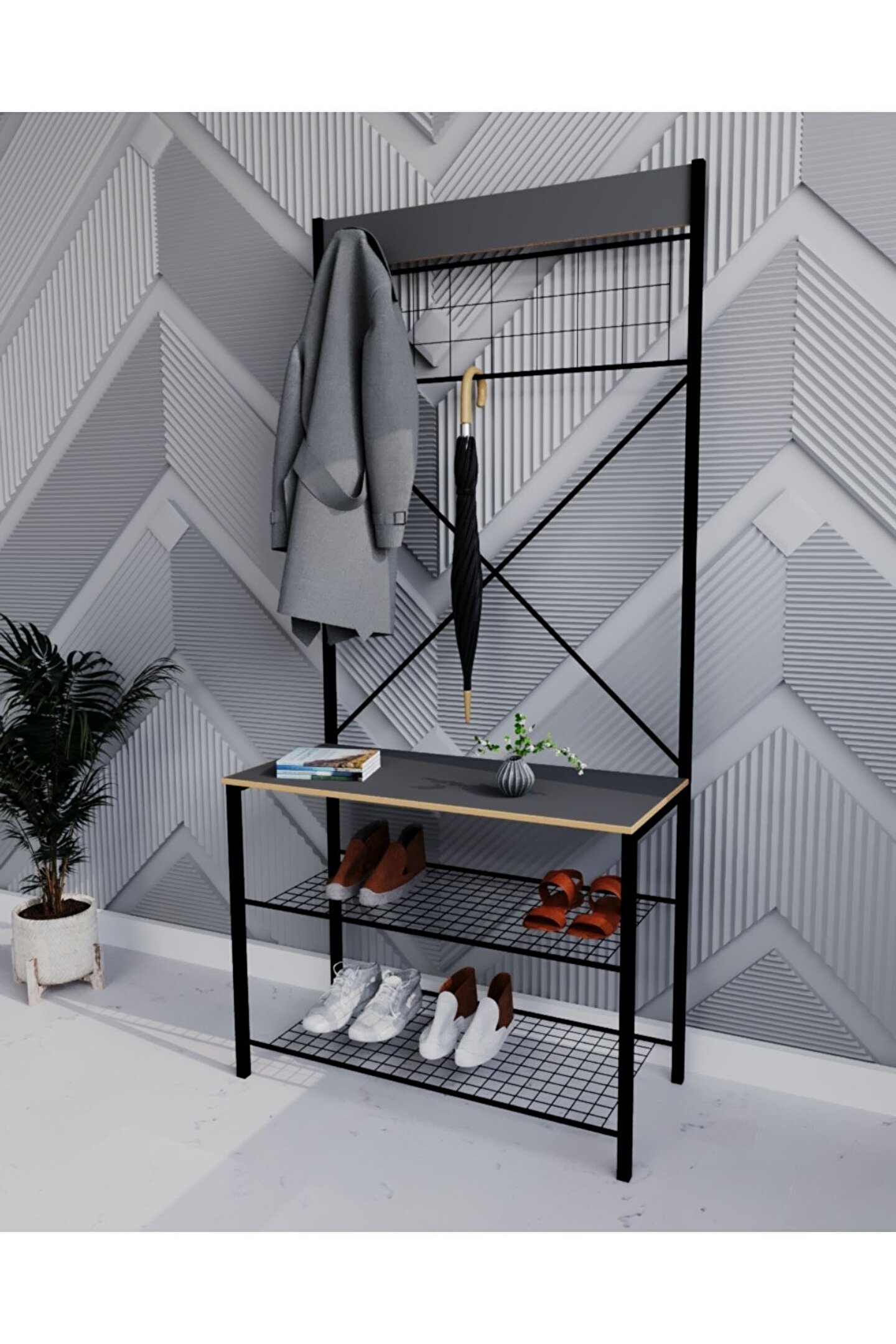 Ürün Ölçüleri: Ürün Genişliği: 80 Cm Ürün Derinliği: 30 Cm Ürün Ayakkabılık Kısım Yüksekliği: 60 Cm Ürün Raf Araları Yüksekliği: 25 Cm Ürün Sırt Yüksekliği: 170 Cm Ürün Özellikleri: Ürün ahşap kısımları 1,8mm kalınlığında suntalamden üretilmiştir . ; Metal kısımları elektrostatik boyalıdır demir malzemeden üretilmiştir, demonte olarak gönderim yapılacaktır. ; Görseldeki diğer ürünler aksesuar amaçlı kullanılmıştır ürün içinde gönderilmeyecektir. ; MDF profil ile oldukça sağlam ve dayanıklı yapıdadır.;