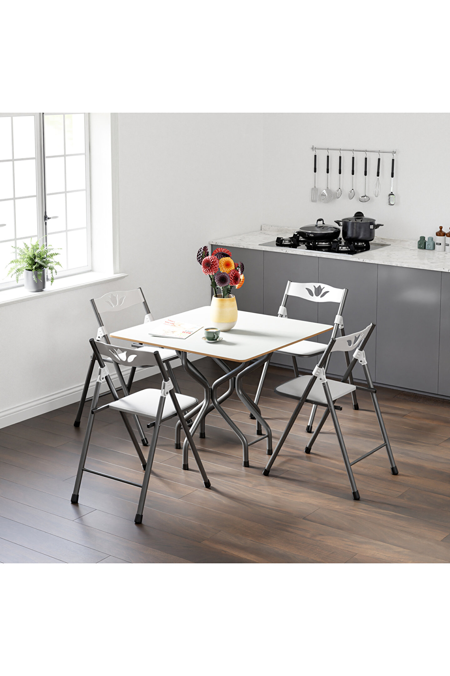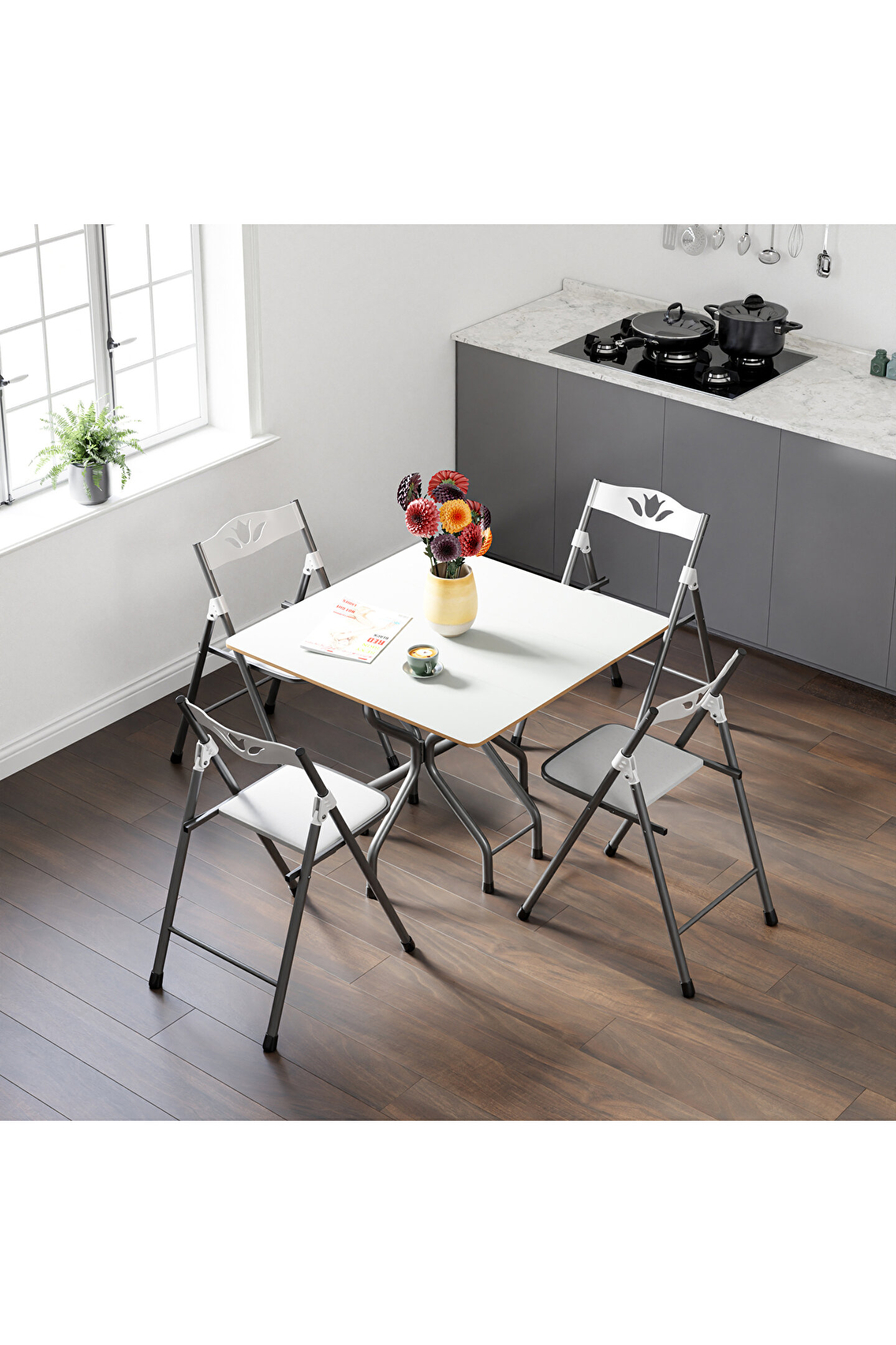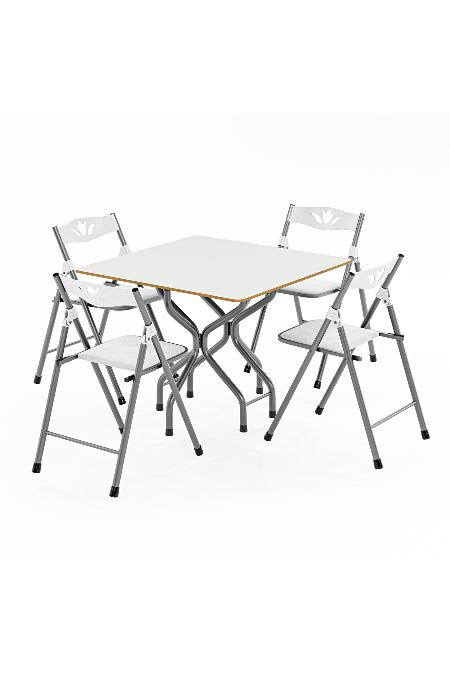 Kırma masa sandalye seti: Masa teknik bilgileri: 90 cm * 90 cm kare ölçülerdedir. ; Yerden yüksekliği 72 cm’dir. ; Elektrostatik boyalı Metal ayaklara sahiptir. ; Ahşap Beyaz Mermer Desenli Sunta lam. ; Katlanabilir iki ayrı kanada sahiptir. ; Sandalye: Mutfak Balkon Salon Gibi iç Mekanlarda Kullanılmak İçin Tasarlanmış Olup Şık Görünümü Sayesinde Bulunduğu Ortama Ayrı Bir Güzellik Katacaktır. ; Sandalyelerin Sırt ve Mafsalları Plastik Özelliktedir. ; Sandalyelerin Oturum yerleri süet kumaştan imal edilmiştir. ; Kapalı Ölçüleri:90*45*5 Oturma Yüksekliği: 45 cm;