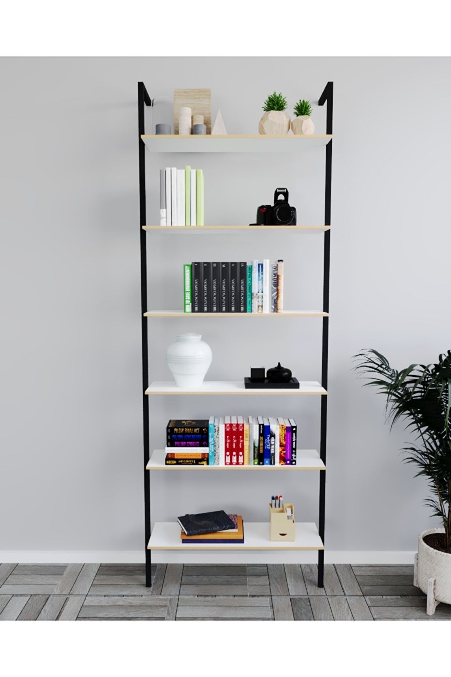 Klasik tasarımıyla her yatak odasına uyum sağlayan metal kitaplık, zamansız bir şıklık sunar; Dayanıklı metal gövde yapısı sayesinde uzun ömürlü kullanım vaat eder ve kitaplarınız için ideal bir saklama alanı oluşturur; 6 katlı geniş raf dizaynı ile kitaplarınızı, dekoratif objelerinizi ve diğer eşyalarınızı düzenli bir şekilde sergilemenize olanak tanır; Beyaz renk seçeneğiyle mekanınıza aydınlık ve ferah bir atmosfer katar, dekorasyonunuza modern bir dokunuş ekler;