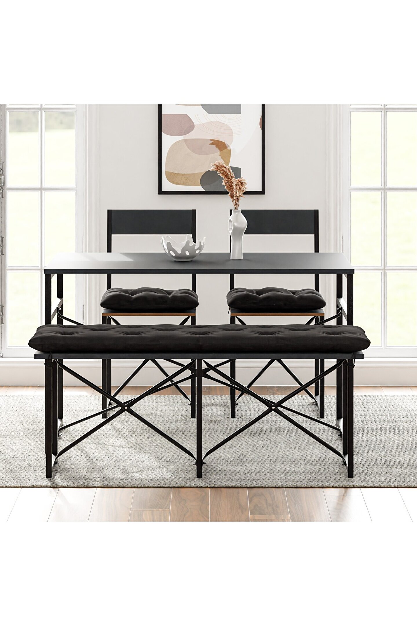 Set, fonksiyonel beklentileri estetik ile buluşturan dinamik bir yapıya sahiptir. 120 cm x 60 cm ölçülerindeki geniş masa tablası, yemeklerinizi, çalışmalarınızı veya toplantılarınızı rahatça gerçekleştirebileceğiniz bir alana sahiptir. 70 cm'lik ideal yüksekliği, ergonomik bir oturma ve kullanım deneyimi sağlar. Ayrıca, bench ve sandalyelerin uyumlu tasarımı, göze hitap ettiği kadar konfor da sunar.