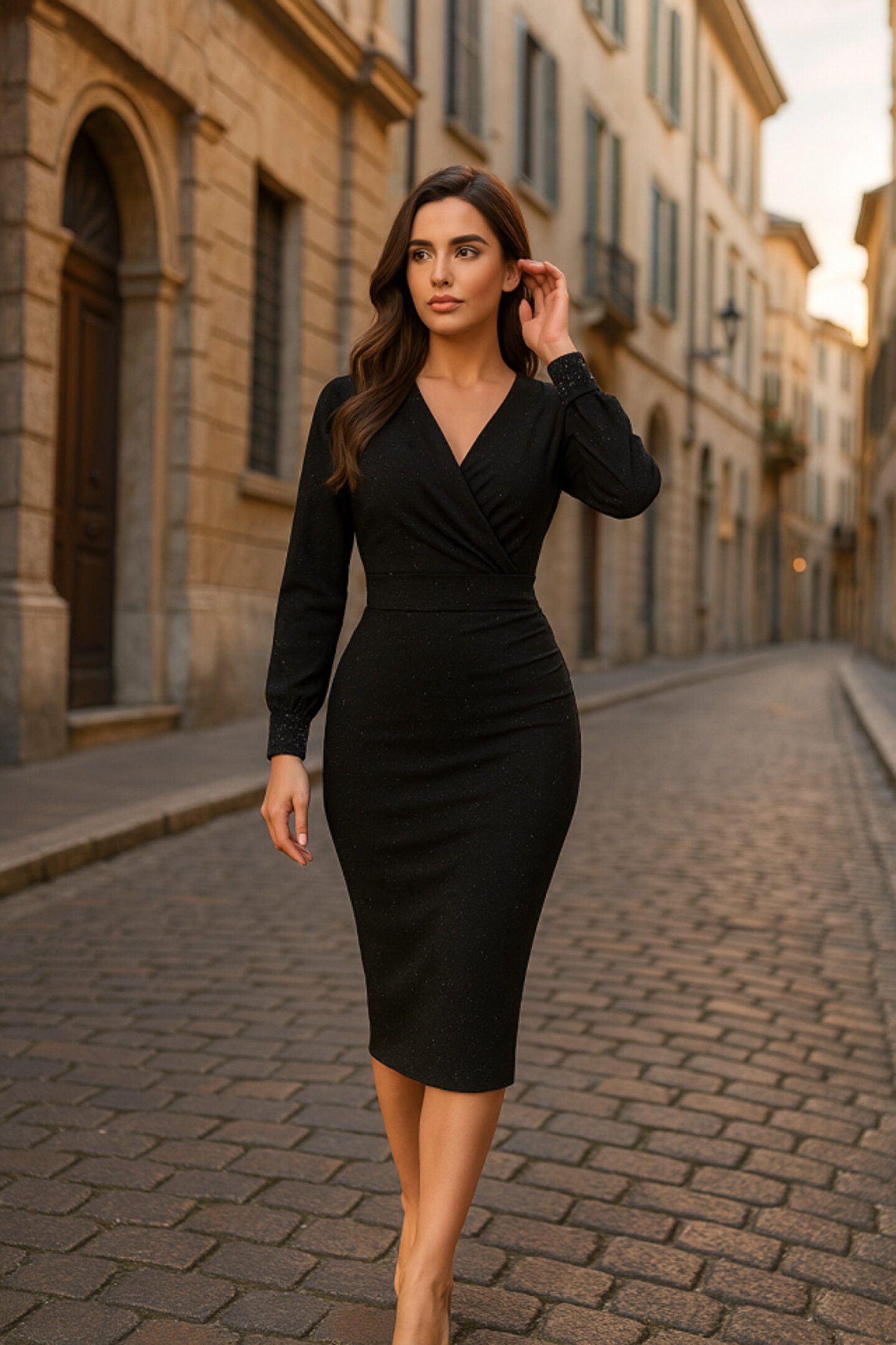Kadın Uzun Kollu Kruvaze Yaka Büzgü Ve Balon Kol Detay Krep Kumaş Maxi Boy Elbise