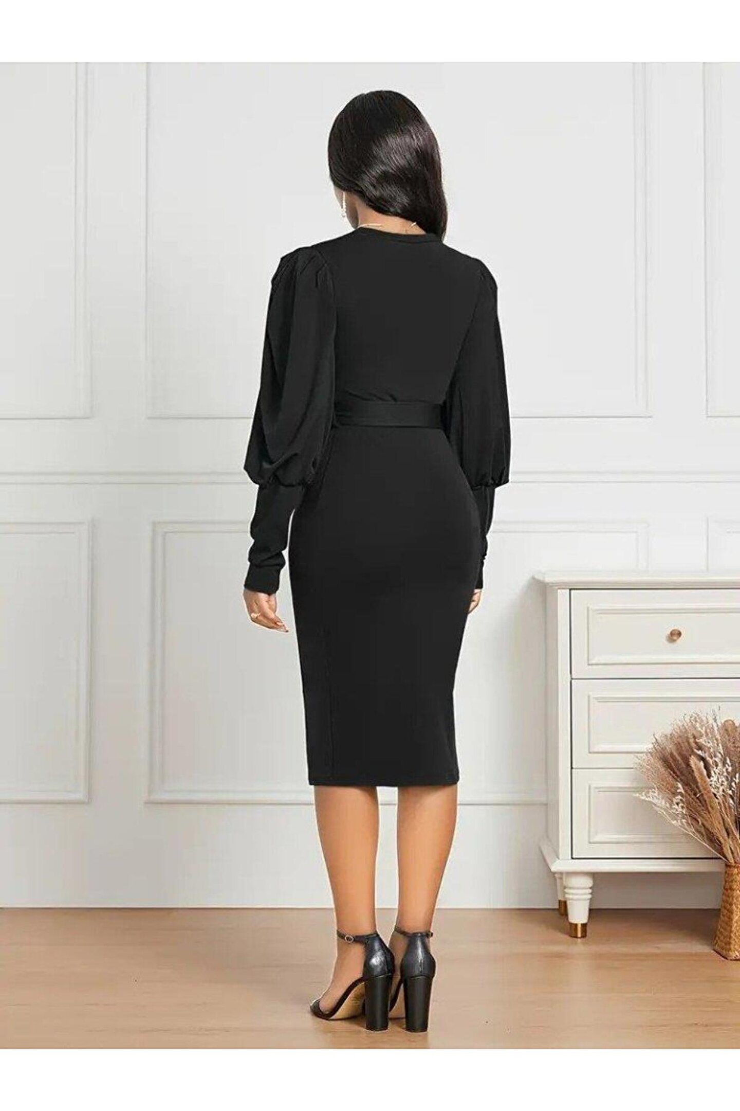 Kadın Uzun Kollu Bisiklet Yaka Beli Kuşaklı Ithal Krep Midi Elbise