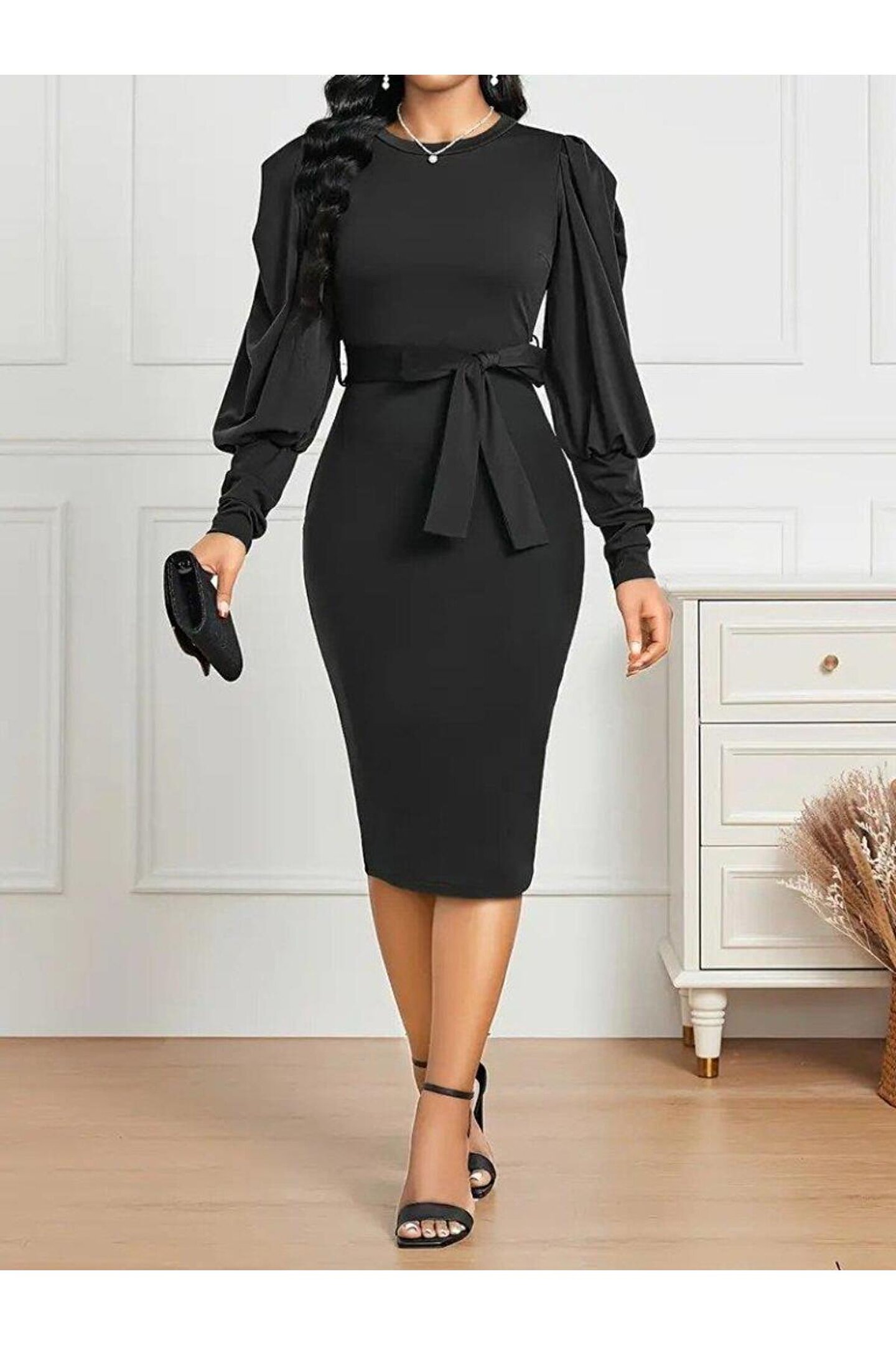 Kadın Uzun Kollu Bisiklet Yaka Beli Kuşaklı Ithal Krep Midi Elbise