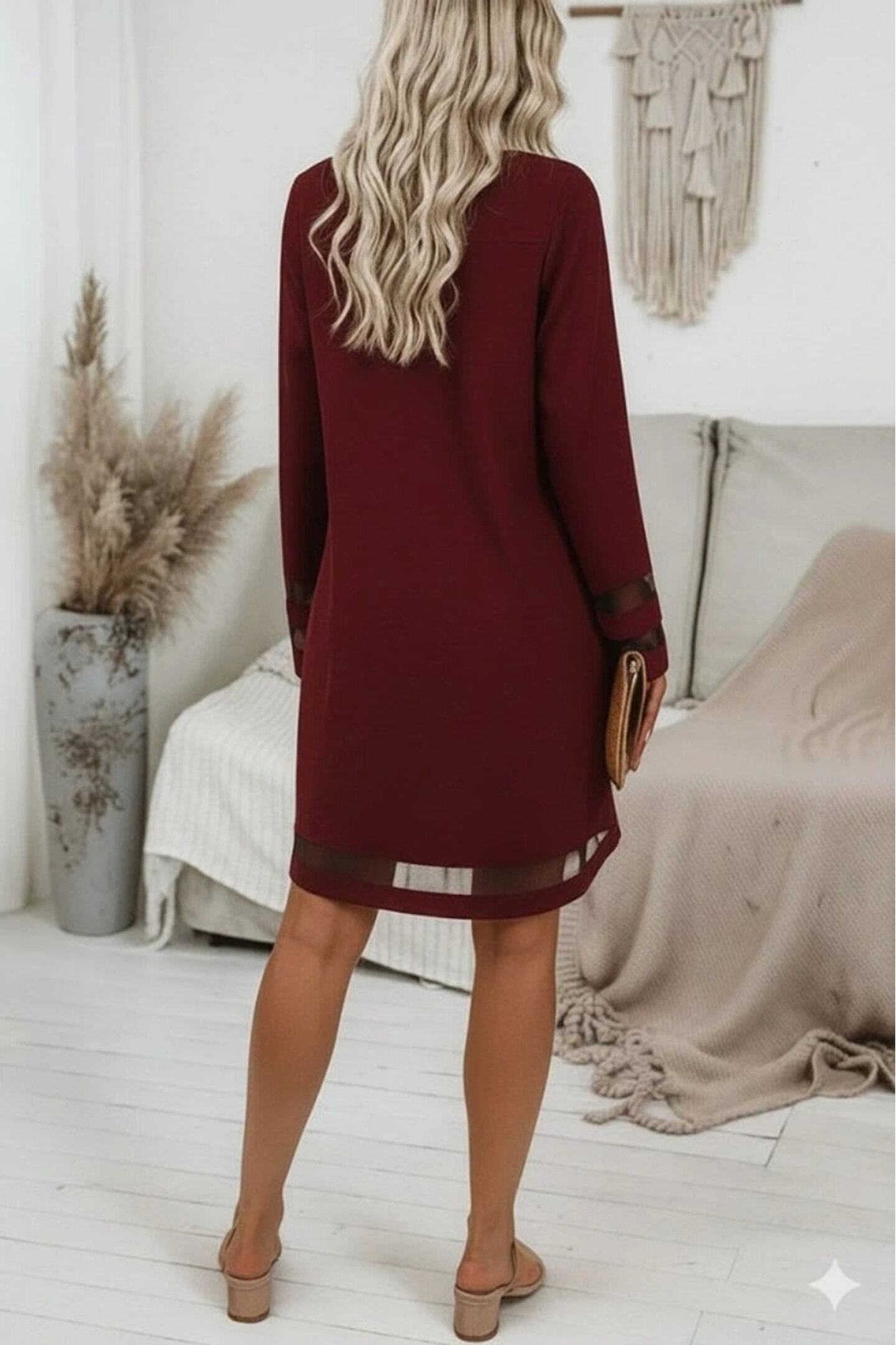 Kadın Uzun Kollu V Yakalı Tül şerit Detaylı Mini Krep Elbise