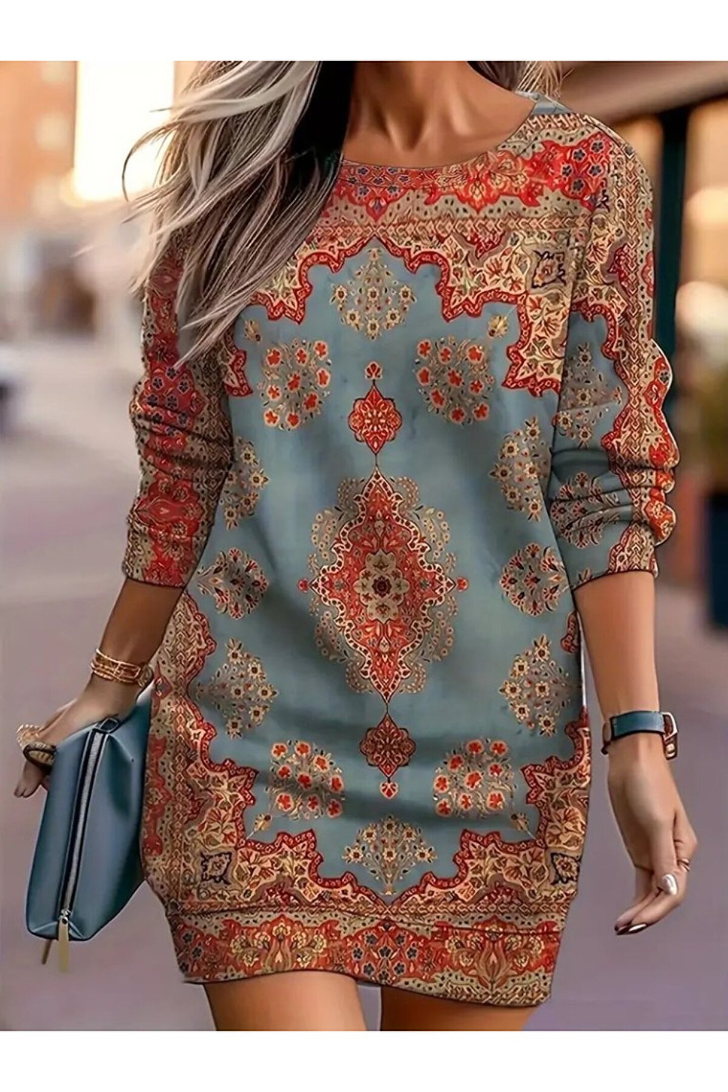 Kadın Uzun Kollu Yuvarlak Yaka Desenli Mini Modal Elbise