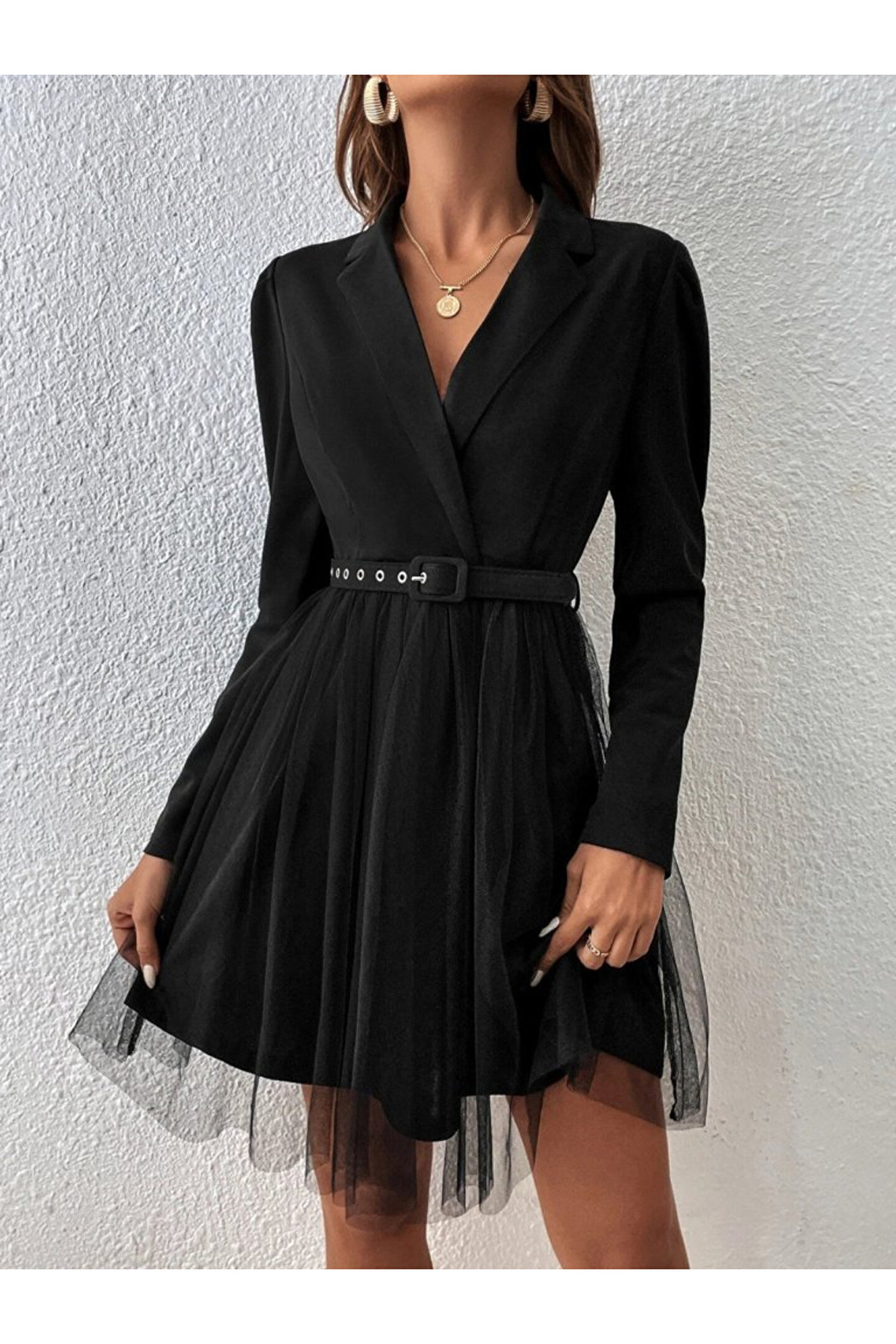 Kadın Uzun Kollu Yakalı Belinde Kemer Detaylı Mini Tüllü Ithal Krep Elbise