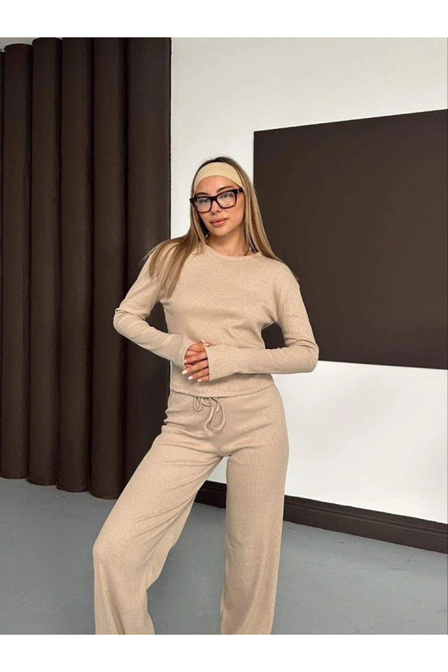 Kadın Bisiklet Yaka Parmak Geçme Detay Uzun Kollu Bluz Ve Pantolon Ikili Takım