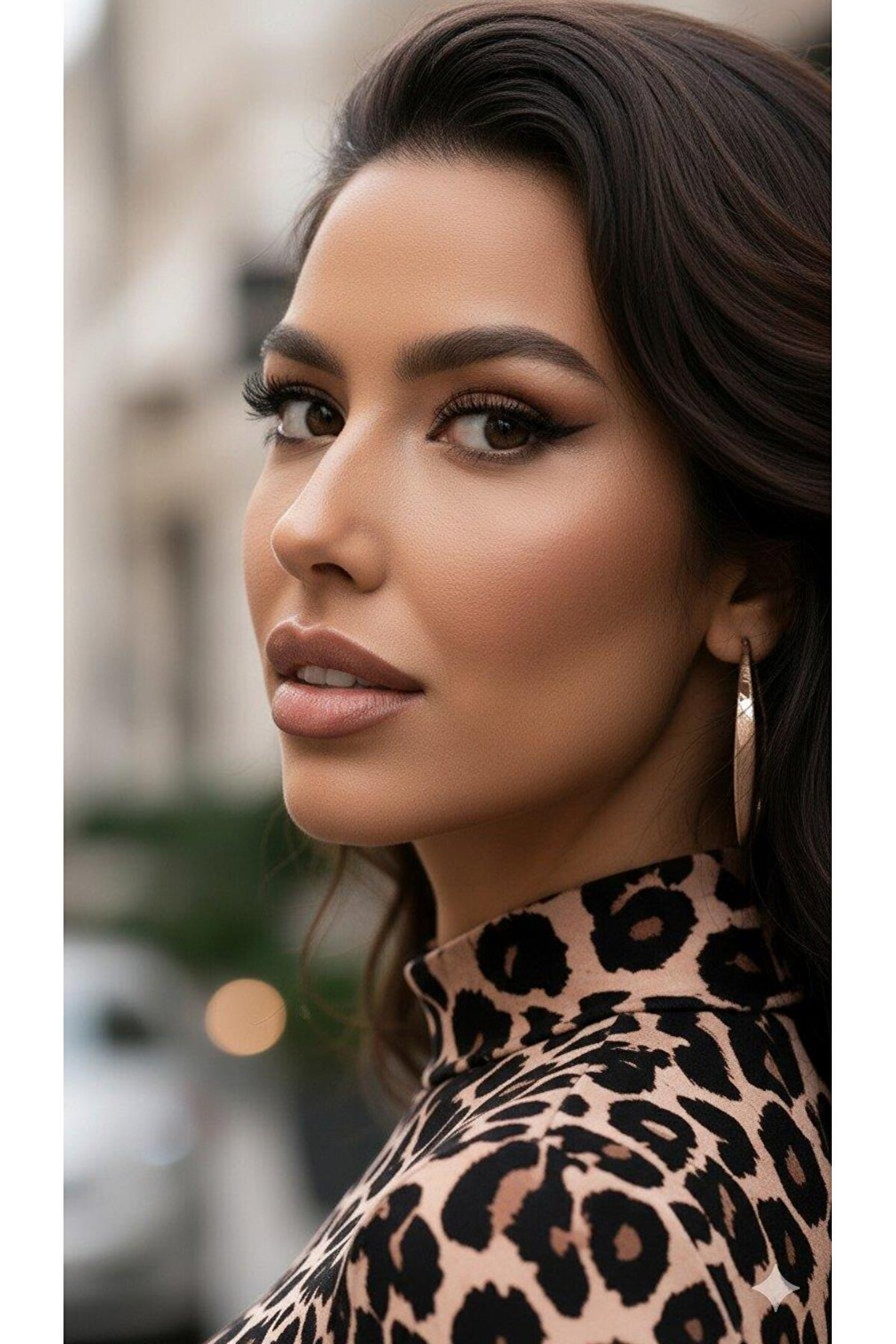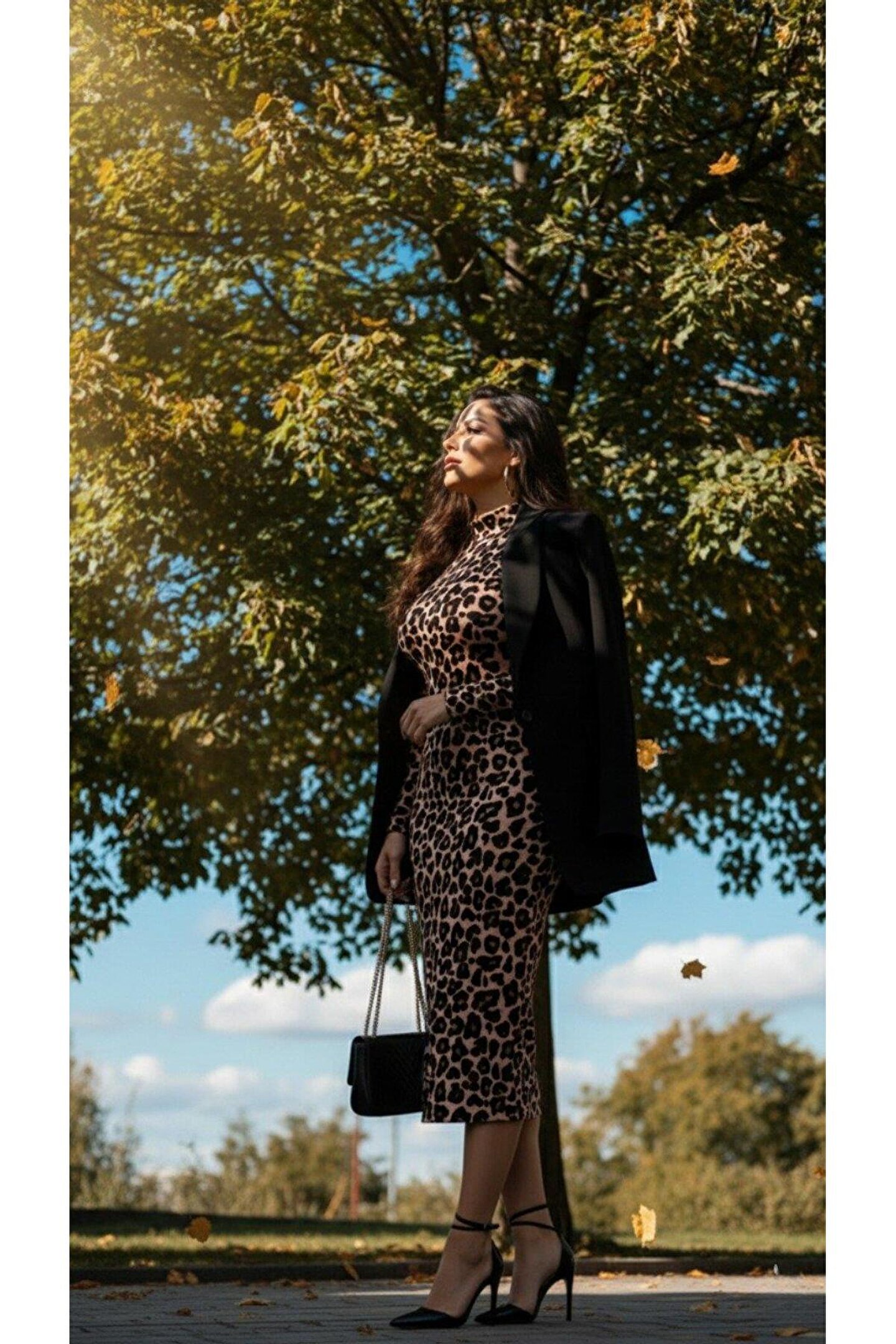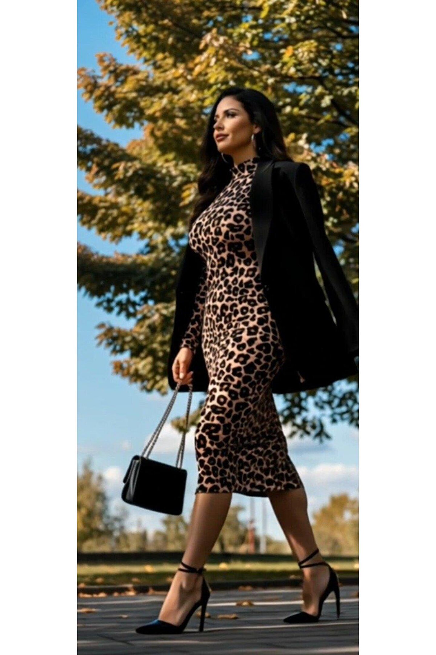 ermege Kadın Uzun Kollu Balıkçı Yaka Leopar Desenli Midi Boy Elbise