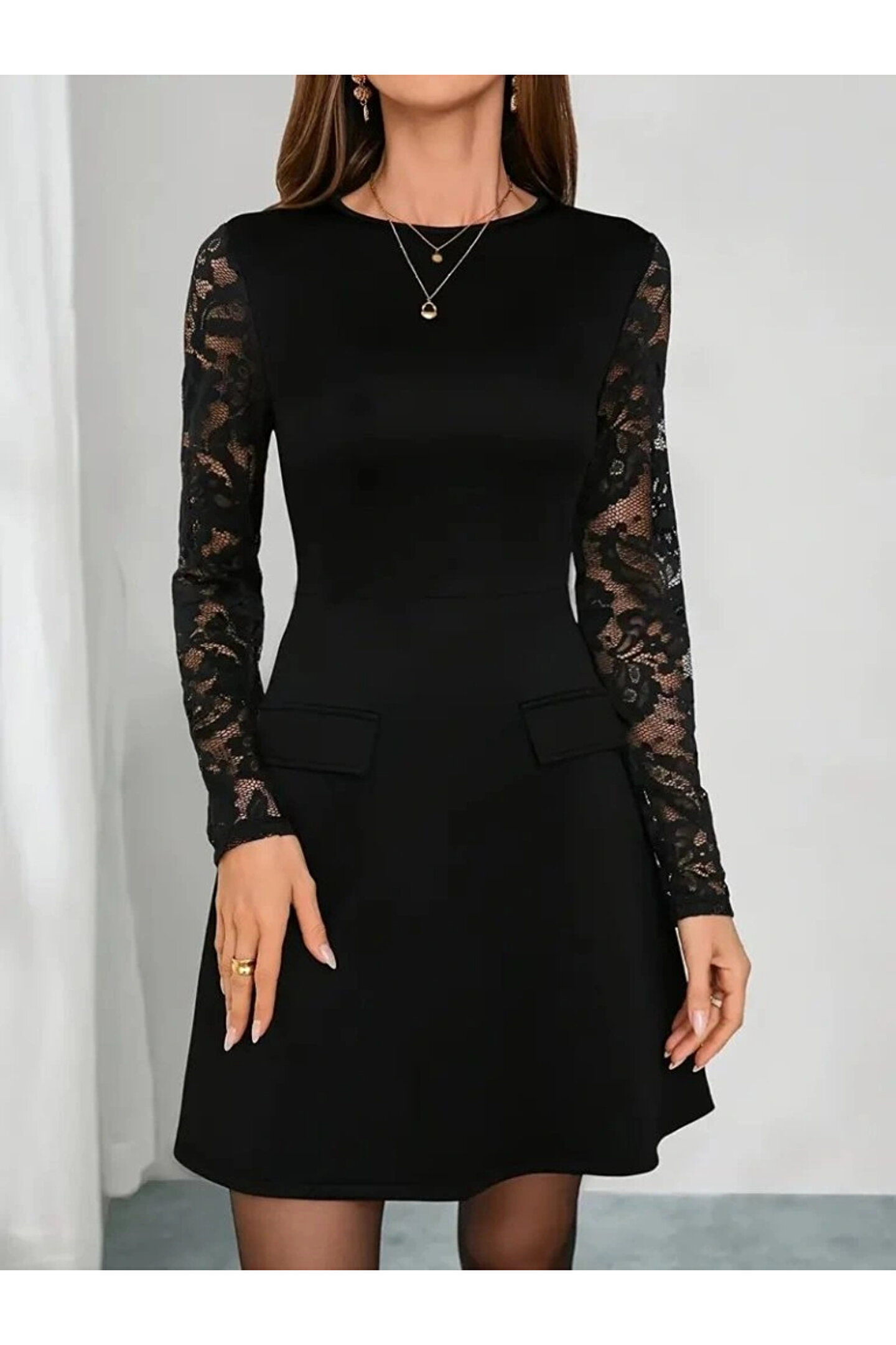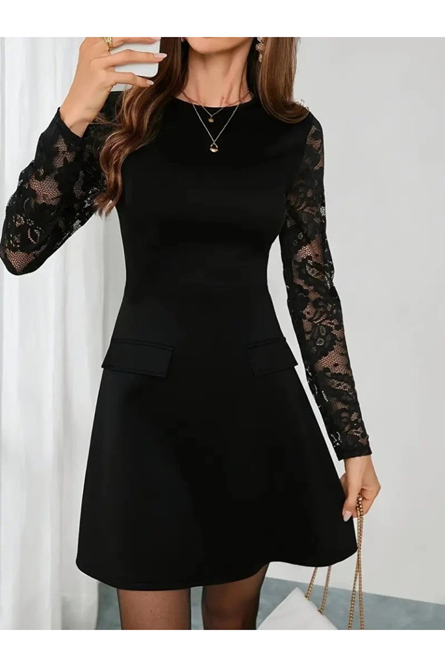 Kadın Uzun Kollu Bisiklet Yaka Kolları Tül Detaylı Mini Ithal Krep Elbise