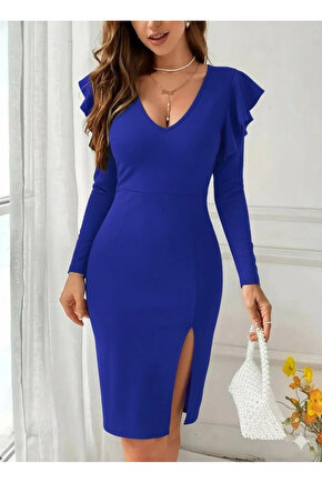 Kadın Uzun Kollu V Yakalı Yandan Yırtmaçlı Midi Ithal Krep Elbise