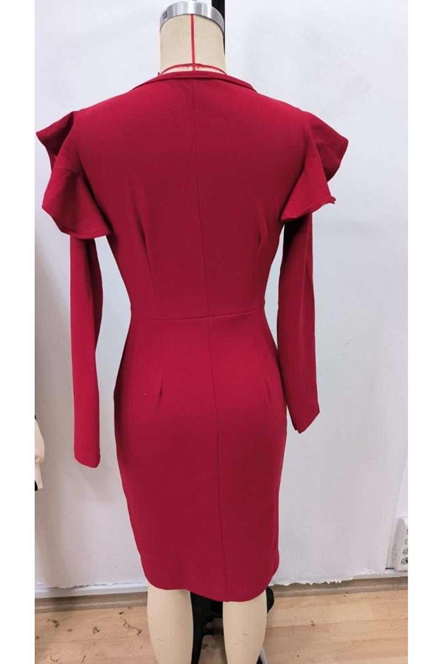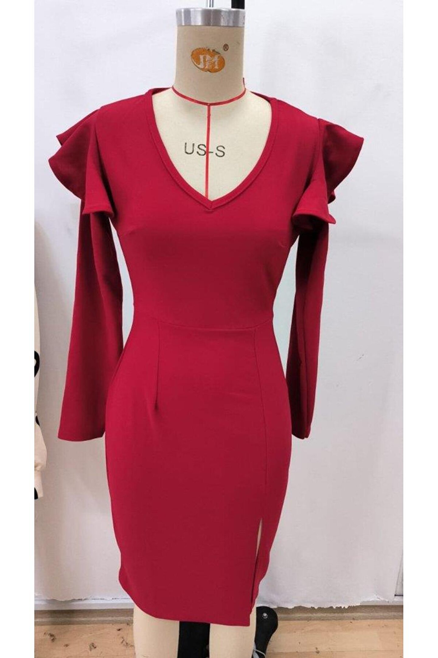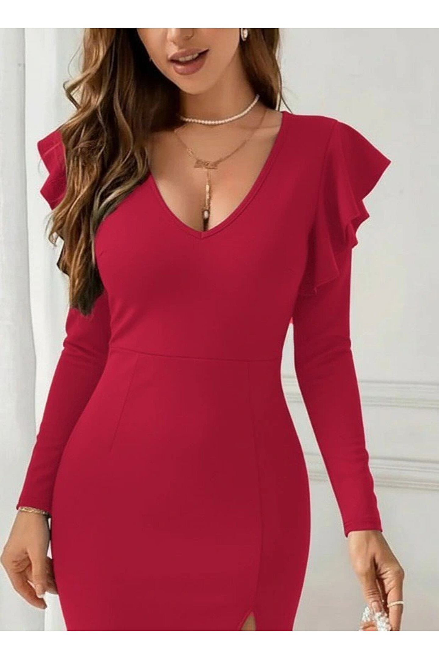 ermege Kadın Uzun Kollu V Yakalı Yandan Yırtmaçlı Midi Ithal Krep Elbise