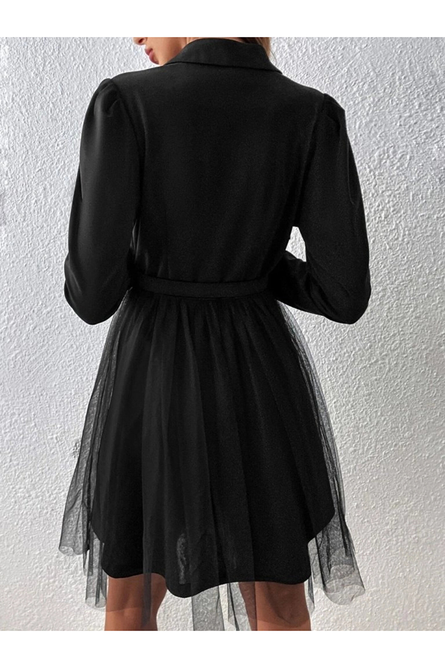 Kadın Uzun Kollu Yakalı Belinde Kemer Detaylı Mini Tüllü Ithal Krep Elbise