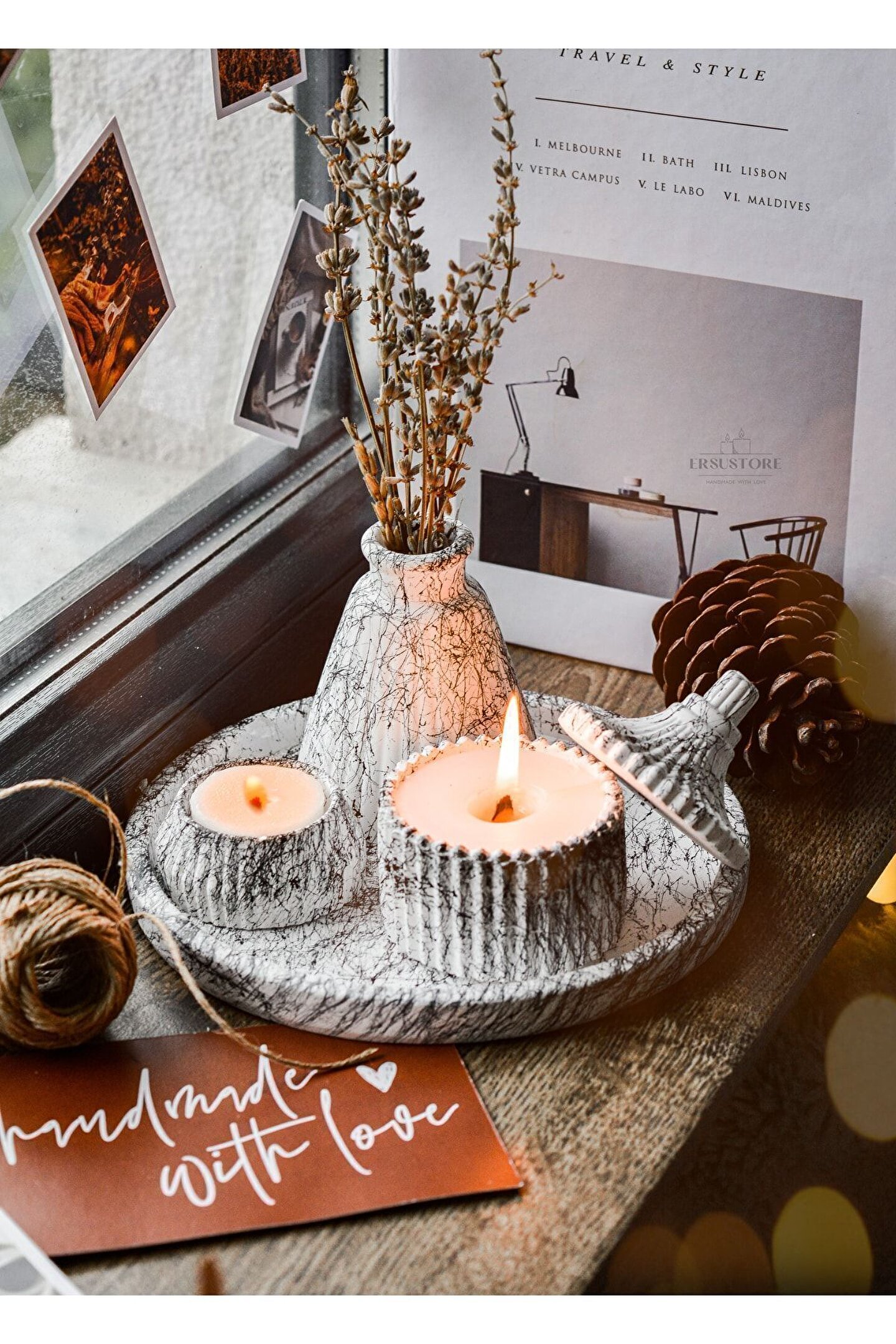 5 Parça Mermer Desen Dekoratif Beton Vazo Ve Vanilya Kokulu Soya Wax Mumluk Takımı