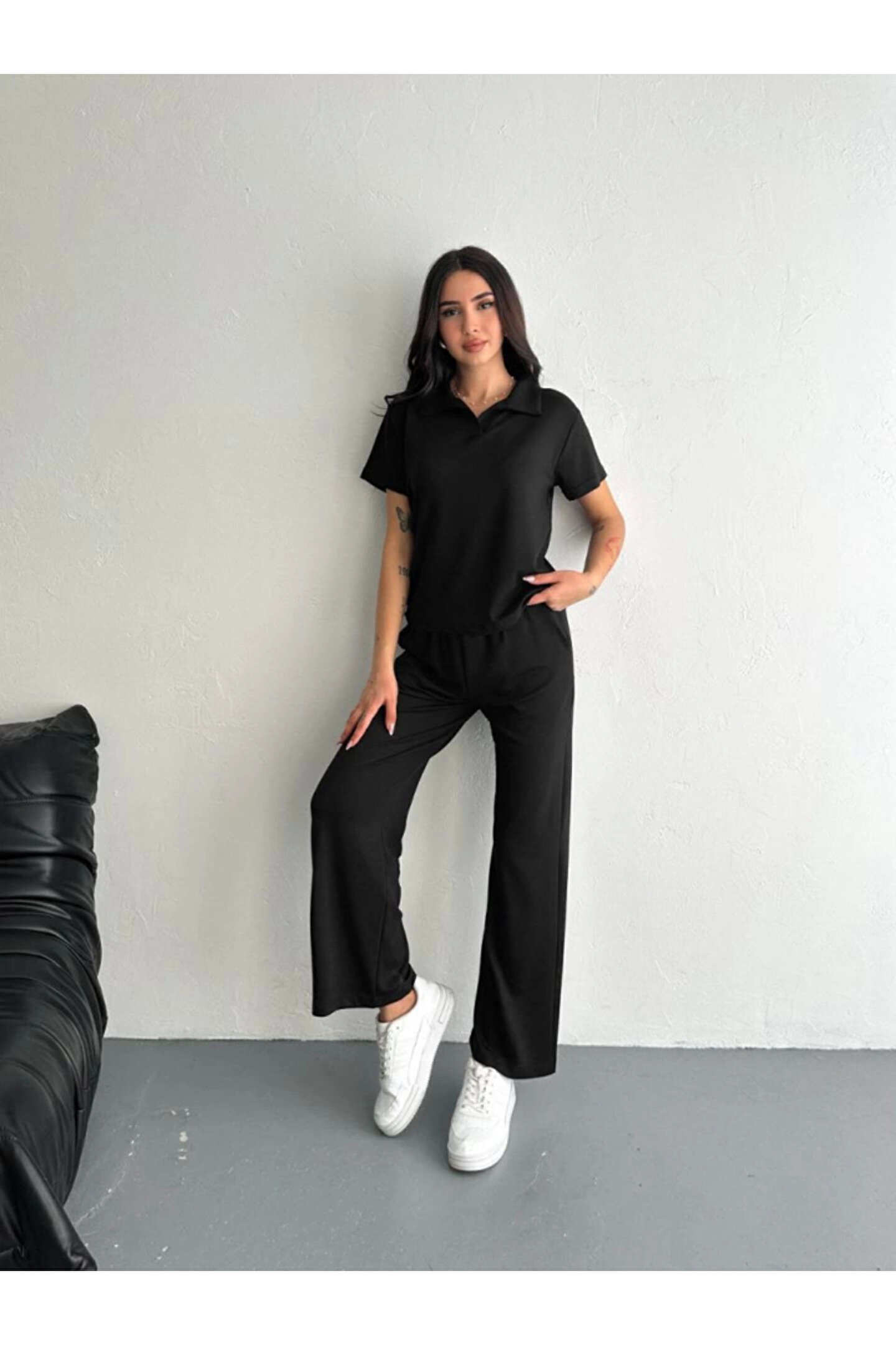 eryvon Osy Modal Yumuşak Dokulu Kumaş Kısa Kollu Yakalı T-shirt Pantalon Ikili Takım- Siyah